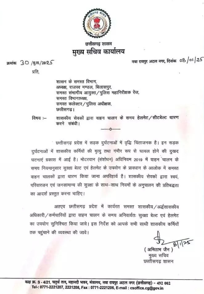 बता दें कि मुख्य सचिव अमिताभ जैन की ओर से 8 जनवरी को तमाम कलेक्टर और पुलिस अधीक्षकों को पत्र जारी किया गया था, जिसमें प्रदेश में बढ़ती सड़क दुर्घटनाओं पर चिंता जताते हुए तमाम शासकीय-अर्द्धशासकीय अधिकारी-कर्मचारियों द्वारा गाड़ी चलाते समय अनिवार्य रूप से सुरक्षा बेल्ट और हेलमेट का उपयोग सुनिश्चित करने कहा गया था.