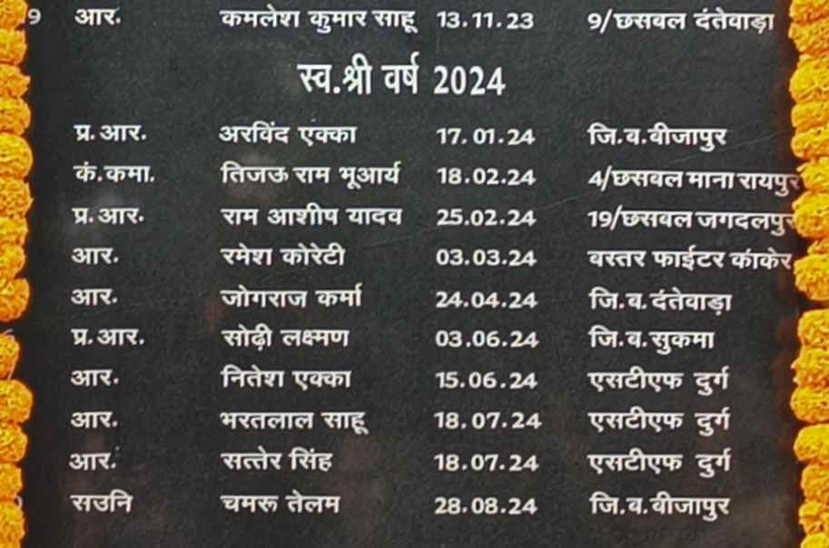 कार्यक्रम के दौरान शहीद कमलेश कुमार साहू, अरविंद एक्का, राम आशीष यादव, रमेश कोरेटी, जोगराज कर्मा, तिजऊ राम भूआर्य, चमरू तेलम, नितेश एक्का, भरत लाल साहू, सत्येंद्र सिंह और सोढ़ी लक्ष्मण को श्रद्धांजलि अर्पित की गई.