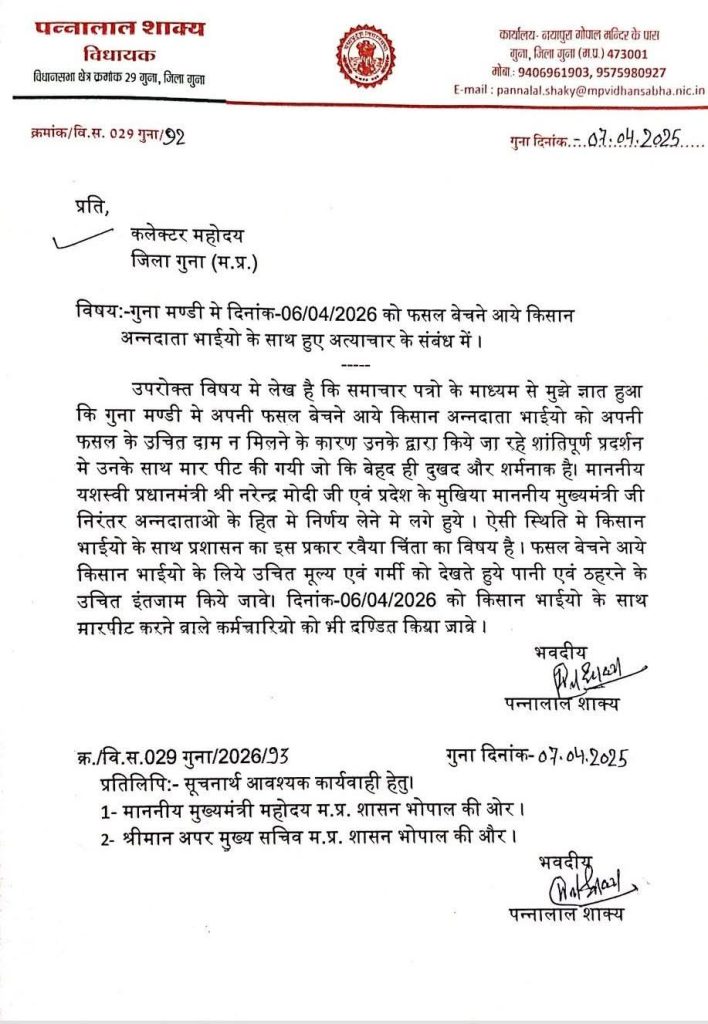एस आर रघुवंशी, गुना। मध्य प्रदेश के गुना में बीते दिन फसल बेचने गए किसानों से धक्का-मुक्की और मारपीट की घटना से बवाल मच गया है। भाजपा विधायक पन्नालाल शाक्य ने इसे लेकर नाराजगी जताई है। उन्होंने मुख्यमंत्री डॉ. मोहन यादव को पत्र लिखकर पुलिसकर्मियों के खिलाफ कार्रवाई की मांग की है। कलेक्टर किशोर कुमार कन्याल ने मामले की जांच कर उचित कार्रवाई का आश्वासन दिया है।