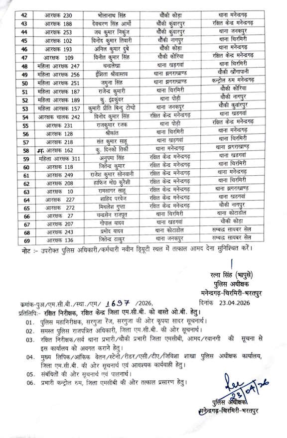 रायपुर। प्रशासनिक कसावट के लिहाज से मनेंद्रगढ़-चिरमिरी-भरतपुर पुलिस अधीक्षक रत्ना सिंह ने थोक में सहायक उप निरीक्षक, प्रधान आरक्षक और आरक्षकों का थोक में तबादला किया गया है. आदेश से 4 सहायक उप निरीक्षक, 13 प्रधान आरक्षक और 52 आरक्षक प्रभावित हुए हैं.
