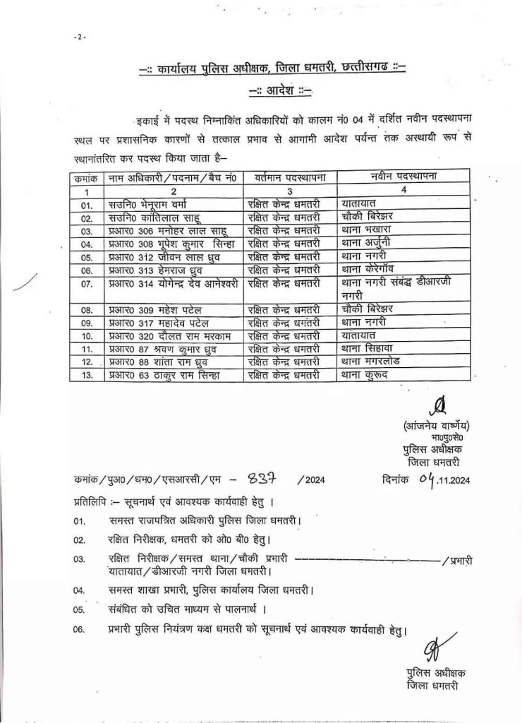 CG Police Transfer: धमतरी पुलिस विभाग में तबादला हुआ है, जिसमें 13 पुलिसकर्मियों का ट्रांसफर किया गया है. इस सूची में दो सहायक उपनिरीक्षक (ASI) और 11 प्रधान आरक्षक के नाम शामिल हैं, जो कि वर्तमान में रक्षित केंद्र में पदस्थ थे. यह ट्रांसफर एसपी आंजनेय वार्ष्णेय ने जारी की है.