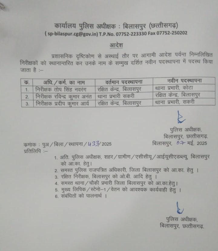 वीरेन्द्र गहवई, बिलासपुर। वरिष्ठ पुलिस अधीक्षक (SSP) रजनेश सिंह ने पुलिस महकमे में फेरबदल करते हुए तीन थाना प्रभारियों के ट्रांसफर आदेश जारी किए हैं. इस आदेश के तहत कोटा और सकरी थानों में नए टीआई की नियुक्ति की गई है, जबकि एक थानेदार को पुलिस लाइन अटैच कर दिया गया है.