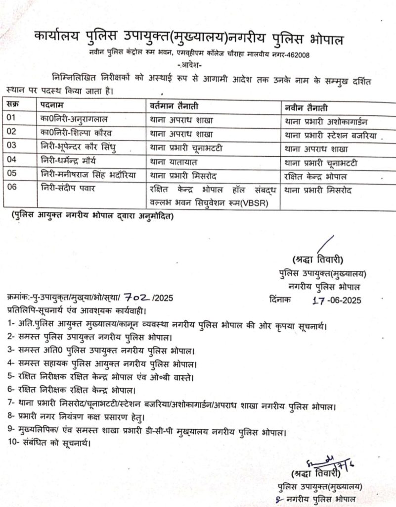 शब्बीर अहमद, भोपाल। राजधानी भोपाल में मंगलवार देर रात कई थाना प्रभारियों को इधर से उधर किया गया है। अनुराग लाल को अशोका गार्डन थाने की कमान मिली है। वहीं शिल्पा कौरव को बजारिया थाने भेज दिया गया है। भूपेंद्र कोर सिंधु को थाना अपराध शाखा भेजा। वहीं धर्मेंद्र मौर्य को चुना भट्टी की कमान मिली है। संदीप पवार को मिसरोद थाने की कमान मिली है। मिसरोद थाना प्रभारी मनीष भदौरिया को पुलिस लाइन में भेजा गया है।
