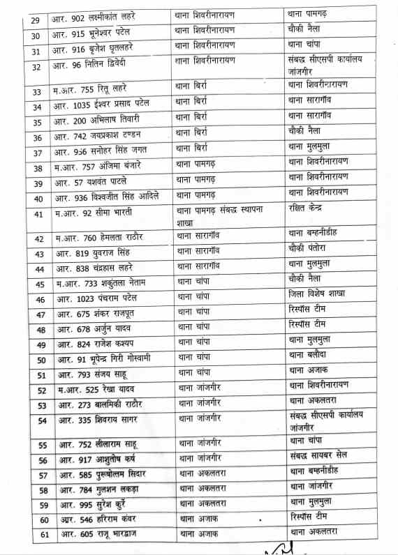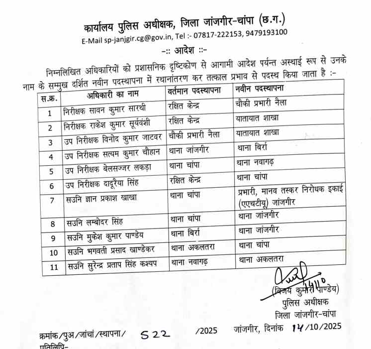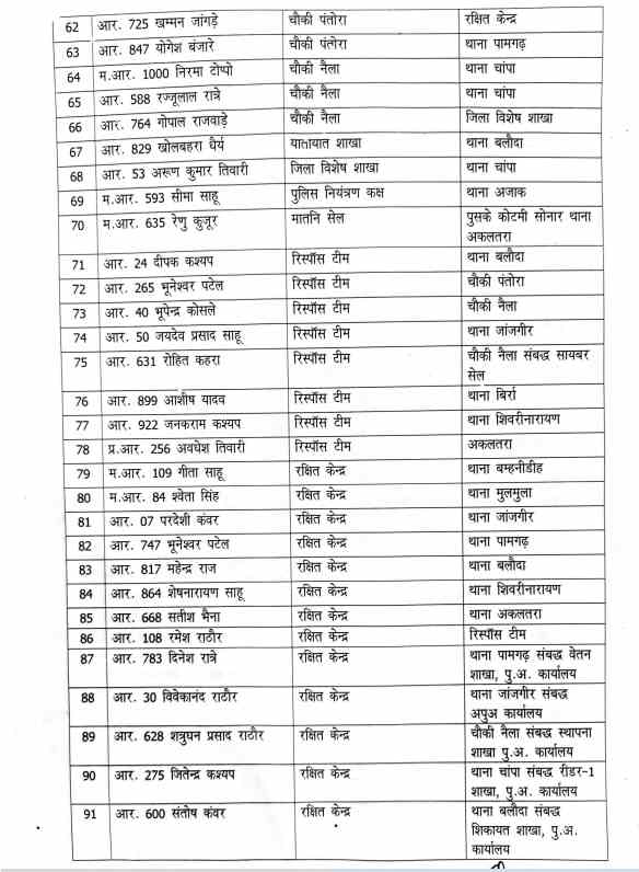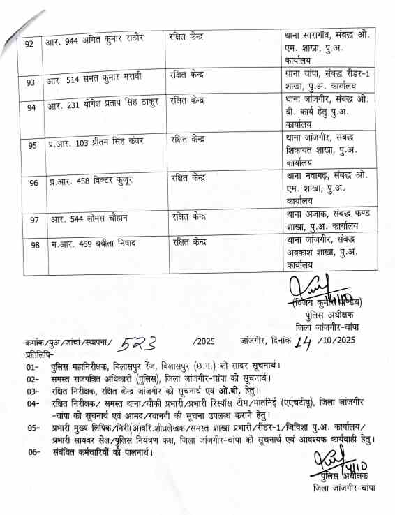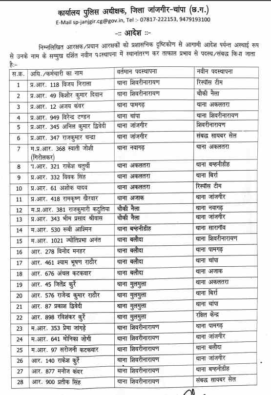 जांजगीर-चांपा। पुलिस विभाग में बड़े पैमाने पर तबादला किया गया है. जांजगीर चांपा एसपी विजय कुमार पाण्डेय ने जिले में 108 पुलिसकर्मियों को इधर से उधर किया है. जारी ट्रांसफर आदेश में थाना प्रभारी, एसआई, एएसआई, हेड कांस्टेबल, कांस्टेबल शामिल हैं.