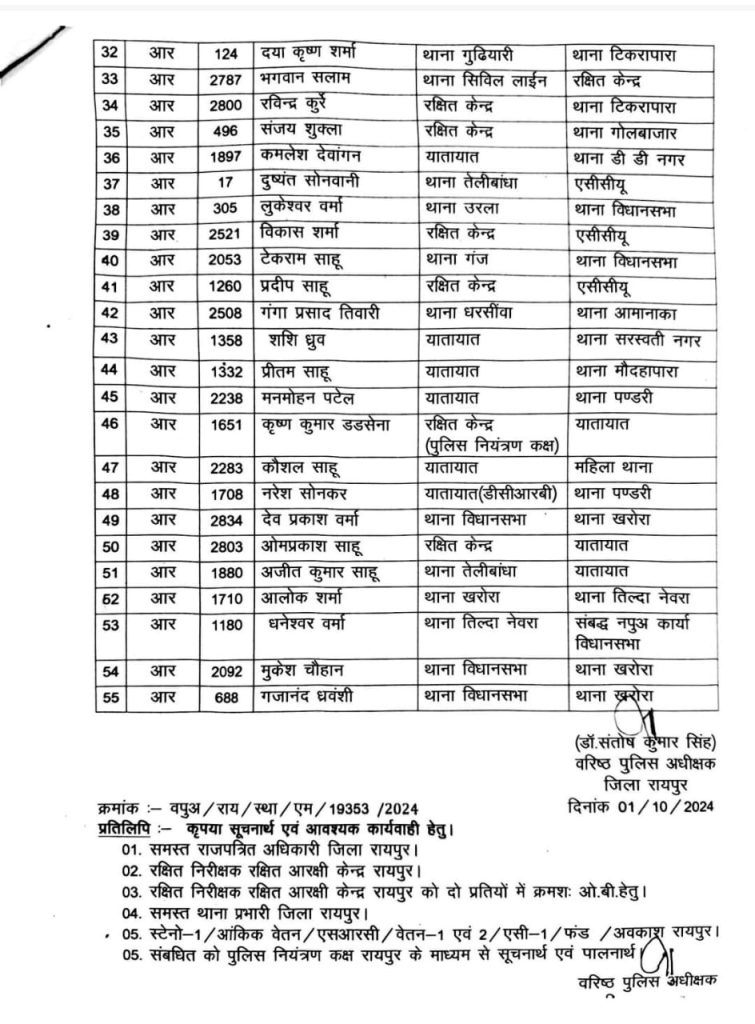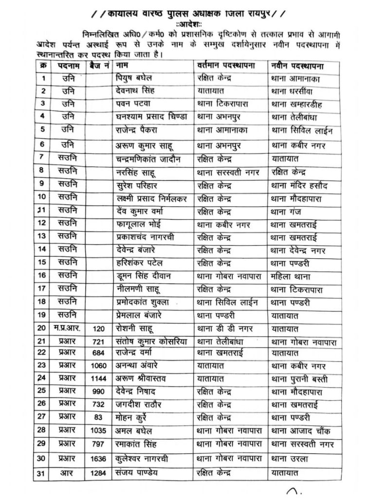 जारी आदेश के अनुसार, 6 SI, 13 ASI, 01 महिला प्रधान आरक्षक, 10 प्रधान आरक्षक, 25 आरक्षकों का ट्रांसफर हुआ है.