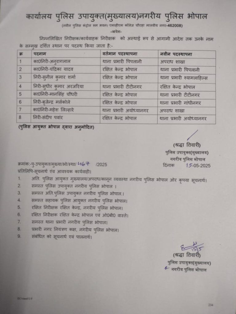 शिखिल ब्यौहार, भोपाल। राजधानी भोपाल में कई थाना प्रभारियों को इधर से उधर किया गया है। बाणगंगा चौराहे पर हुए बस एक्सीडेंट की जांच में थाना टीटी नगर पुलिस की भूमिका संदिग्ध पाई गई थी। थाना प्रभारी सुधीर अरजरिया को हटाकर रक्षित केंद्र भेजा गया है। थाना अयोध्या नगर थाना प्रभारी बदले गए, संदीप पवार को नया टीआई बनाया गया है। चंद्रिका यादव को पिपलानी थाना प्रभारी बनाया गया। सुनील कुमार शर्मा को श्यामला हिल्स थाना प्रभारी बनाया गया। बृजेंद्र मर्सकोले को गांधी नगर थाना प्रभारी बनाया गया है।