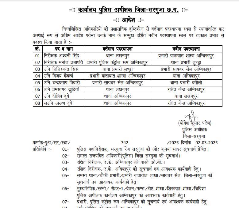 रामकुमार यादव, अंबिकापुर। सरगुजा पुलिस विभाग में बड़ा फेरबदल (Police Transfer) हुआ है, जिसमें टीआई, SI और ASI समेत 8 पुलिसकर्मियों को एक जगह से दूसरी जगह भेजा गया है. यह ट्रांसफर लिस्ट एसपी योगेश पटेल ने जारी किया है.