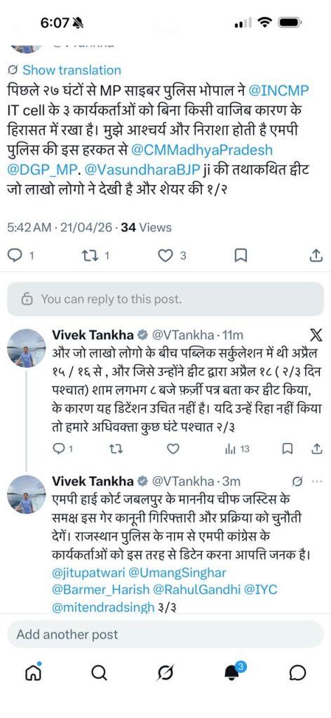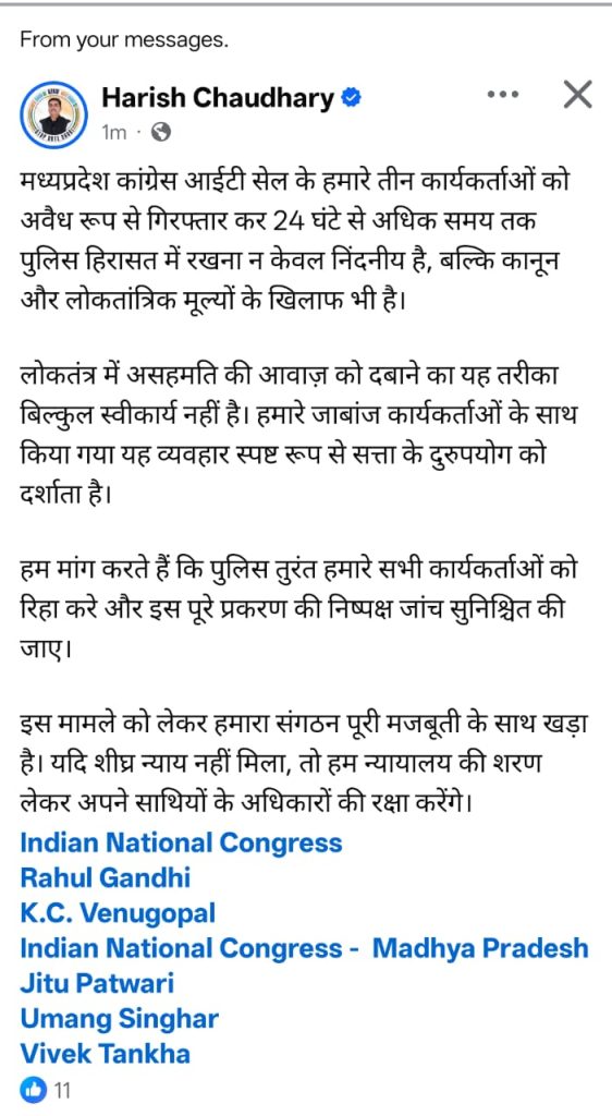 सोशल मीडिया पर हरीश चौधरी ने लिखा- मध्यप्रदेश कांग्रेस आईटी सेल के हमारे तीन कार्यकर्ताओं को अवैध रूप से गिरफ्तार कर 24 घंटे से अधिक समय तक पुलिस हिरासत में रखना न केवल निंदनीय है, बल्कि कानून और लोकतांत्रिक मूल्यों के खिलाफ भी है।लोकतंत्र में असहमति की आवाज़ को दबाने का यह तरीका बिल्कुल स्वीकार्य नहीं है। हमारे जाबांज कार्यकर्ताओं के साथ किया गया यह व्यवहार स्पष्ट रूप से सत्ता के दुरुपयोग को दर्शाता है।हम मांग करते हैं कि पुलिस तुरंत हमारे सभी कार्यकर्ताओं को रिहा करे और इस पूरे प्रकरण की निष्पक्ष जांच सुनिश्चित की जाए। इस मामले को लेकर हमारा संगठन पूरी मजबूती के साथ खड़ा है। यदि शीघ्र न्याय नहीं मिला, तो हम न्यायालय की शरण लेकर अपने साथियों के अधिकारों की रक्षा करेंगे।
