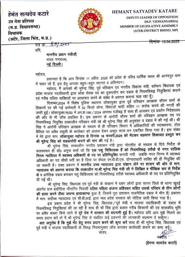 कटारे ने पत्र में लिखा कि महोदय प्रसन्नता है कि आप दिनांक 11 अप्रैल, 2025 को प्रदेश के पवित्र धार्मिक स्थल श्री आनंदपुर धाम में पधार रहे हैं, इस हेतु आपका बहुत बहुत स्वागत व अभिनंदन। महोदय, मैं आपको भूपेन्द्र सिंह, पूर्व परिवहन एवं नगरीय विकास मंत्री, वर्तमान विधायक एवं प्रदेश भाजपा पदाधिकारी द्वारा लोक सेवक पद का दुरूपयोग कर दबाव से नियमविरूद्ध नियुक्तियां कराने एवं गरीब दलित व्यक्तियों पर अत्याचार करने के संबंध में अवगत कराना चाह रहा हूँ।