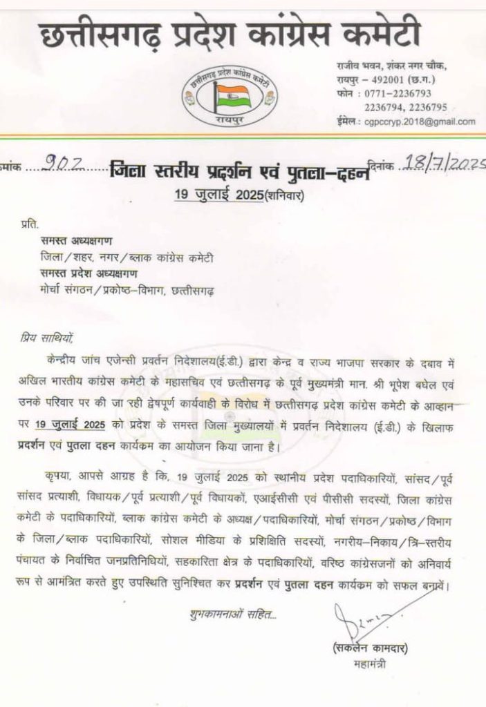 दीपक बैज ने साफ किया कि यह कार्रवाई लोकतंत्र के खिलाफ है और कांग्रेस इसका जोरदार विरोध करेगी। उन्होंने ऐलान किया कि 19 जुलाई, शनिवार को छत्तीसगढ़ के सभी ज़िलों में ईडी के खिलाफ प्रदर्शन और पुतला दहन किया जाएगा। कांग्रेस ने ईडी की कार्रवाई को सत्ता का दुरुपयोग बताया है और आगामी 19 जुलाई को पूरे प्रदेश में विरोध प्रदर्शन की तैयारी में जुट गई है।