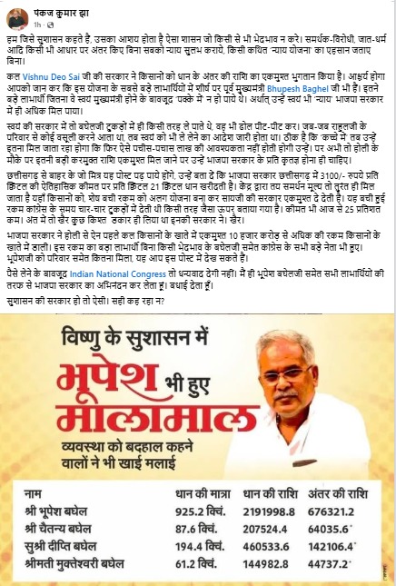 उन्होंने कहा कि छत्तीसगढ़ से बाहर के जो मित्र यह पोस्ट पढ़ पाये होंगे, उन्हें बता दें कि भाजपा सरकार छत्तीसगढ़ में 3100 रुपये प्रति क्विंटल की ऐतिहासिक कीमत पर प्रति क्विंटल 21 क्विंटल धान खरीदती है. केंद्र द्वारा तय समर्थन मूल्य तो तुरंत ही मिल जाता है यहाँ किसानों को, शेष बची रकम को अलग योजना बना कर सायजी की सरकार एकमुश्त दे देती है. यह बची हुई रकम कांग्रेस के समय चार-चार टुकड़ों में देती थी किसी तरह जैसा ऊपर बताया गया है. कीमत भी आज से 25 प्रतिशत कम. अंत में तो खैर कुछ किश्त डकार ही लिया था इनकी सरकार ने. खैर.