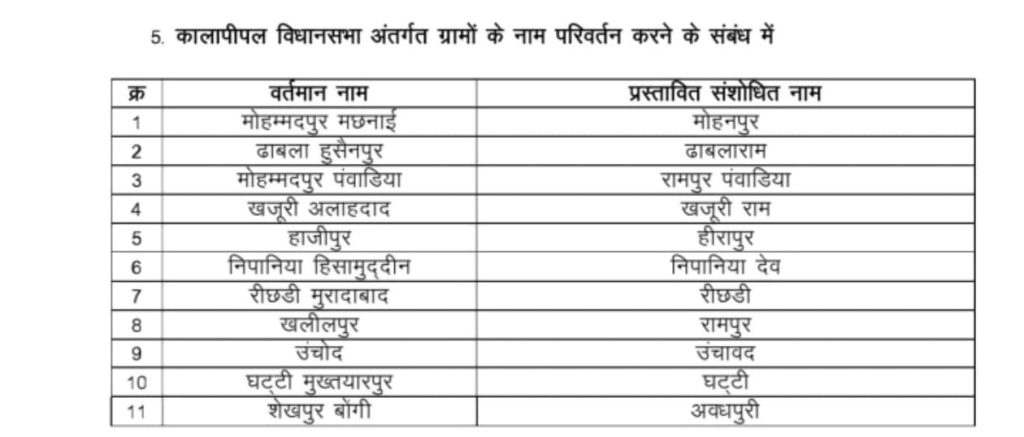 गौरतलब है कि मुख्यमंत्री डॉ. मोहन यादव लगातार अपने कार्यक्रमों में गांवों के नाम बदलने का ऐलान कर रहे है। कल रविवार को शाजापुर जिले की तहसील कालापीपल में आयोजित कार्यक्रम में सीएम डॉ. मोहन ने 11 गांव का नाम बदलने की घोषणा की। शाजापुर के मोहम्मदपुर मछनाई को मोहनपुर, ढाबला हुसैनपुर को ढाबला राम, मोहम्मदपुर पवाड़िया को रामपुर पवाड़िया, खजूरी अलाहदाद को खजूरी राम, हाजीपुर को हीरापुर, ग्राम निपानिया हिस्सामुद्दीन को निपानिया देव, रीछड़ी मुरादाबाद को रीछड़ी, खलीलपुर (ग्राम पंचायत सिलोंदा) को रामपुर, उंचोद को उंचावद, घट्टी मुख्त्यारपुर को घट्टी और शेखपुर बोंगी को अवधपुरी नाम देने का ऐलान किया है।