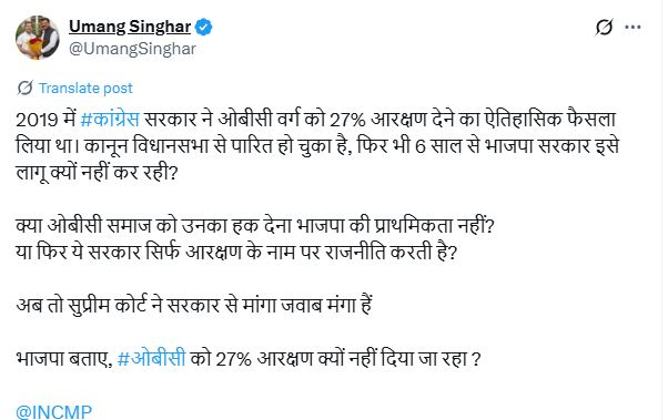 इस मामले में कांग्रेस ने सरकार पर आरोप लगाया हैं। नेता प्रतिपक्ष उमंग सिंगार ने अपने सोशल मीडिया अकाउंट एक्स पर पोस्ट कर लिखा- 2019 में कांग्रेस सरकार ने ओबीसी वर्ग को 27% आरक्षण देने का ऐतिहासिक फैसला लिया था। कानून विधानसभा से पारित हो चुका है, फिर भी 6 साल से भाजपा सरकार इसे लागू क्यों नहीं कर रही? क्या ओबीसी समाज को उनका हक देना भाजपा की प्राथमिकता नहीं? या फिर ये सरकार सिर्फ आरक्षण के नाम पर राजनीति करती है? अब तो सुप्रीम कोर्ट ने सरकार से मांगा जवाब मांगा हैं, भाजपा बताए, ओबीसी को 27% आरक्षण क्यों नहीं दिया जा रहा ?