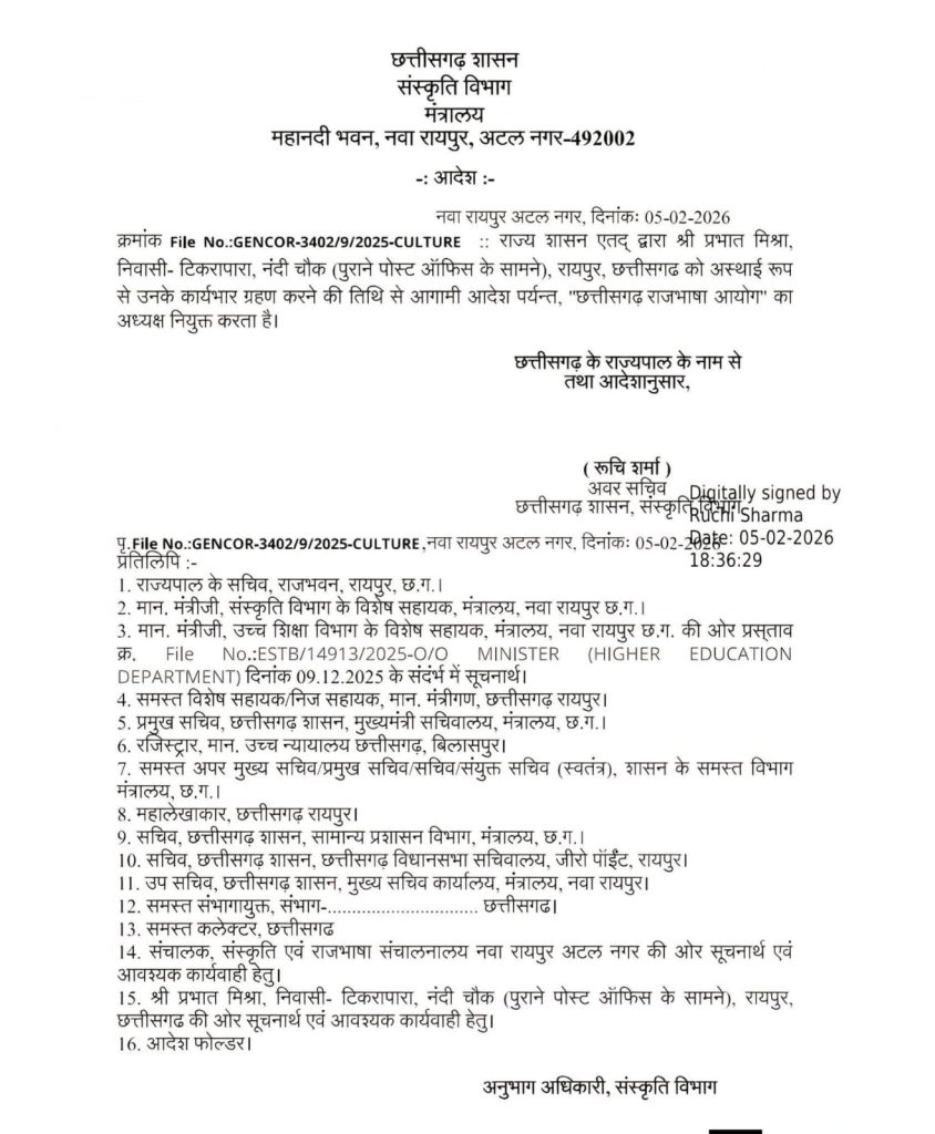 रायपुर। छत्तीसगढ़ शासन ने प्रभात मिश्रा को अस्थाई रूप से छत्तीसगढ़ राजभाषा आयोग का अध्यक्ष नियुक्त किया है। इस संबंध में संस्कृति विभाग ने आदेश जरी किया है। यह नियुक्ति उनके कार्यभार ग्रहण करने की तिथि से अगले आदेश तक प्रभावी रहेगी।