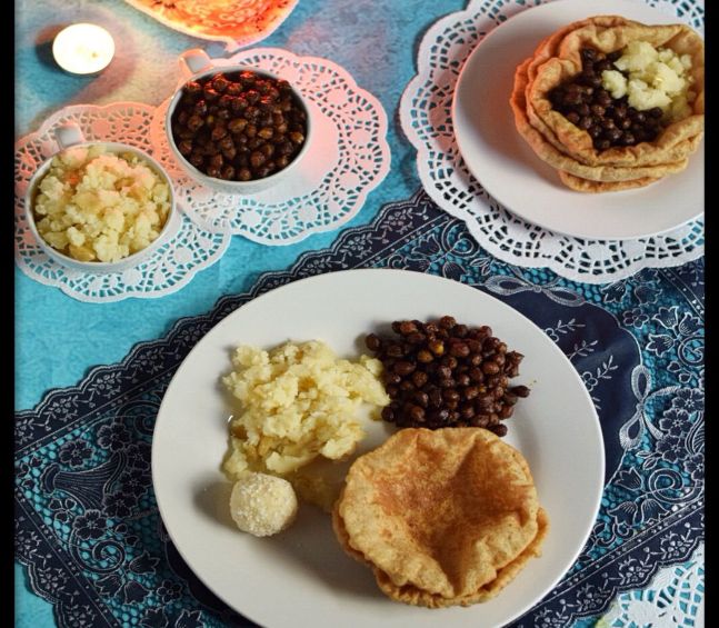 काले चने (काले चने की घुघुरी) – रातभर भिगोकर सुबह उबाले जाते हैं और हल्के मसालों के साथ पकाए जाते हैं. इसे सात्विक तरीके से बनाया जाता है (प्याज-लहसुन के बिना).
