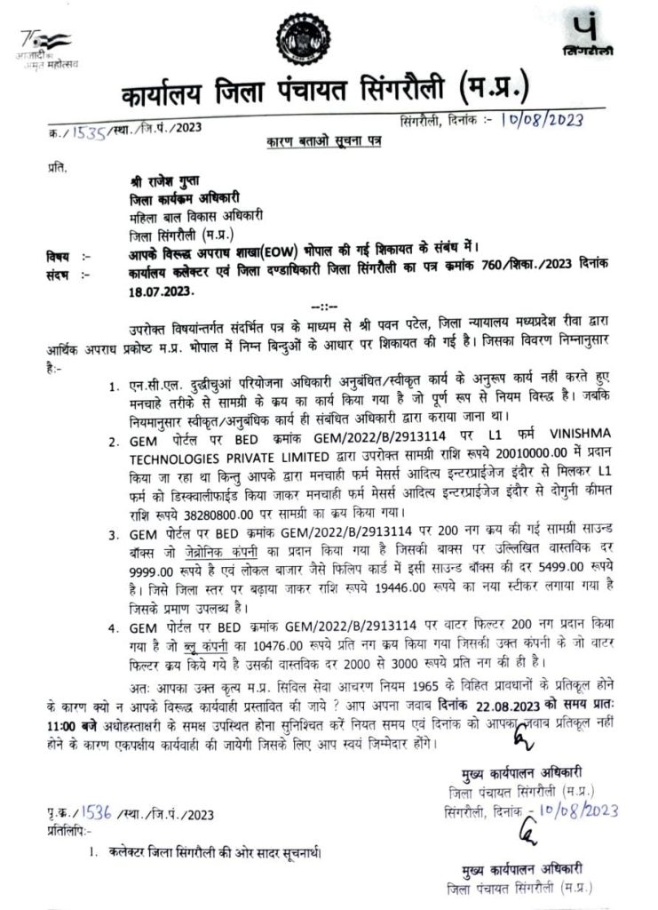 जानकारी उपलब्ध न कराने पर जिला पंचायत के सीईओ गजेंद्र सिंह नागेश ने 14 दिसंबर 2024 को एक पत्र लिखते हुए कलेक्टर को अवगत कराया है कि, उक्त खरीदी के संबंध में महिला बाल विकास जिला कार्यक्रम अधिकारी राजेश राम गुप्ता से कई बार जानकारी मांगी गई। लेकिन उक्त अधिकारी के द्वारा आज तक कोई जवाब नहीं दिया गया है। जिससे अधिकारी के इस कृत्य से वरिष्ठ कार्यालय के गरिमा एवं अनुशासन का स्पष्ट उल्लंघन प्रतीत होता है। उक्त अधिकारी के विभाग में रहते हुए अधोहस्ताक्षर करता आर्थिक अपराध प्रकोष्ठ के महत्वपूर्ण प्रकरण में वरिष्ठ कार्यालय को प्रतिवेदित नहीं किया जा सकता। इसके बावजूद भी सिंगरौली कलेक्टर हाथ पर हाथ रख बैठे हुए हैं।