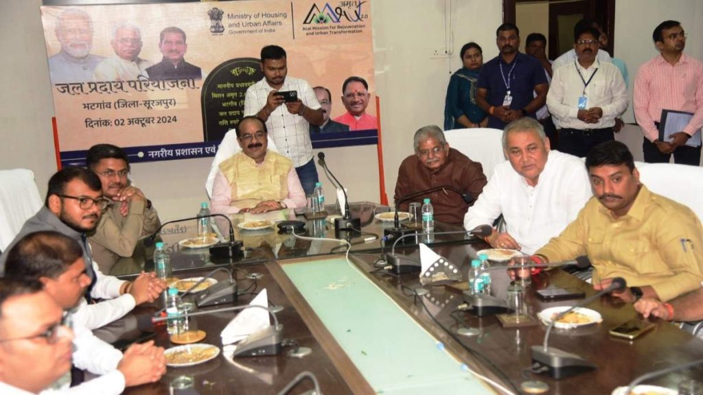 रायपुर. प्रधानमंत्री नरेन्द्र मोदी ने आज गांधी जयंती पर नई दिल्ली के विज्ञान भवन से वीडियो कॉन्फ्रेसिंग के माध्यम से सूरजपुर जिले के भटगांव नगर पंचायत के लिए 56 करोड़ 78 लाख रुपए की लागत की जल प्रदाय योजना का शिलान्यास किया. अमृत मिशन 2.0 के तहत स्वीकृत इस जल प्रदाय योजना का काम अगले दो वर्षों में पूर्ण होगा. उप मुख्यमंत्री और नगरीय प्रशासन और विकास मंत्री अरुण साव बिलासपुर से नई दिल्ली और भटगांव में आयोजित कार्यक्रमों में वर्चुअली शामिल हुए. उनके साथ बिलासपुर से विधायक धरमलाल कौशिक, धर्मजीत सिंह, सुशांत शुक्ला और जिला पंचायत के अध्यक्ष अरुण सिंह चौहान भी दोनों जगहों में आयोजित कार्यक्रमों से ऑनलाइन जुड़े.