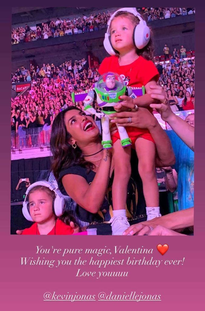 बता दें कि प्रियंका चोपड़ा (Priyanka Chopra) ने इंस्टाग्राम की स्टोरी पर वैलेंटिना के साथ एक प्यारी फोटो शेयर किया है, जिसमें वे वैलेंटिना को गोद में लिए हुए मुस्कुराती हुई नजर आ रही हैं. वैलेंटिना ने कान बंद करने वाले हेडफोन पहने हुए हैं और हाथ में बज लाइटईयर खिलौना पकड़ रखा है. यह फोटो जोनस ब्रदर्स के कॉन्सर्ट के दौरान की है. इसको शेयर करते हुए प्रियंका चोपड़ा (Priyanka Chopra) ने कैप्शन में लिखा, ‘तुम जादू हो वैलेंटिना. जन्मदिन मुबारक. मैं तुमसे प्यार करती हूं.’