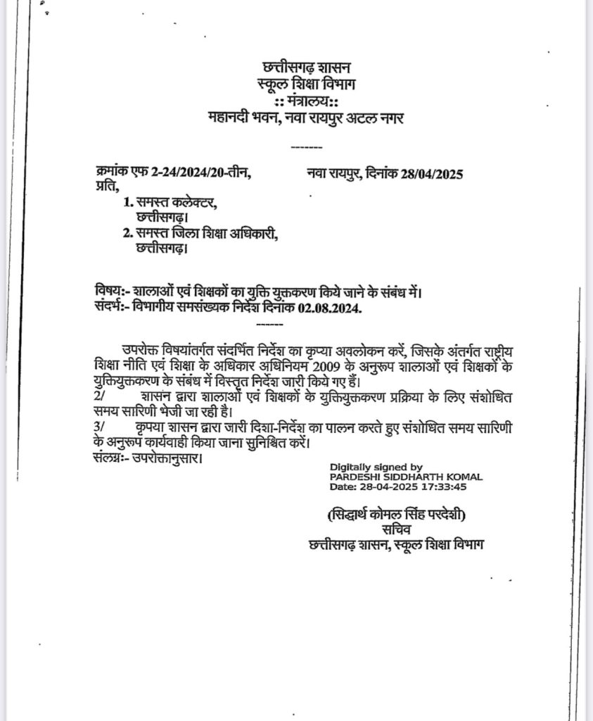 सत्या राजपूत, रायपुर। छत्तीसगढ़ में स्कूलों और शिक्षकों के युक्तियुक्तकरण की प्रक्रिया तेज हो गई है. इसके लिए स्कूल शिक्षा विभाग मंत्रालय ने दिशा-निर्देश भी जारी कर दिया है. इस संबंध में प्रदेश के सभी कलेक्टरों और जिला शिक्षा अधिकारियों को पत्र भेजा गया है. विभाग द्वारा संशोधित समय-सारणी भी जारी की गई है, जिसके अनुरूप युक्तिकरण की कार्रवाई होगी.
