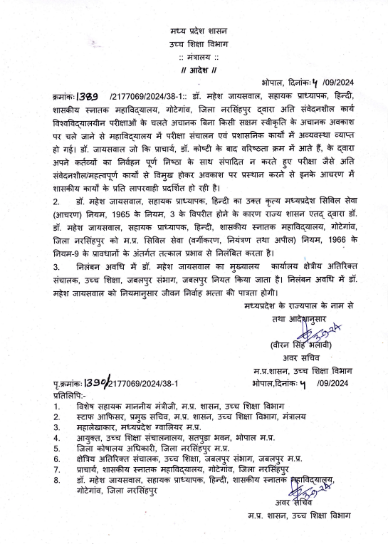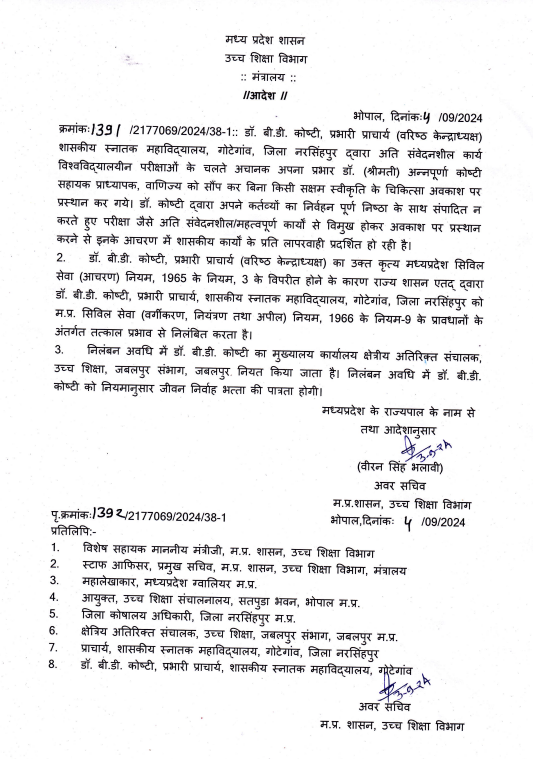 उच्च शिक्षा विभाग में प्रचार्य बीडी कोष्टी और असिस्टेंट प्रोफेसर महेश जायसवाल पर निलंबन की गाज गिरी है। दोनों ही सरकारी कॉलेज में परीक्षाओं के दौरान बिना किसी सूचना के गायब रहे। जिसके चलते सस्पेंड की कार्रवाई की गई है। स्वास्थ्य का हवाला देकर प्राचार्य बीडी कोष्टी ने विभाग को सूचना दिए बिना अन्नपूर्णा कोष्ठी को प्रभारी बनाया था। आपको बता दें कि प्राचार्य और असिस्टेंट प्रोफेसर नरसिंहपुर के गोटेगांव में सरकारी कॉलेज में पदस्थ थे।