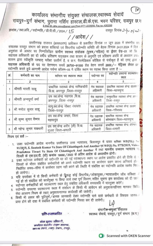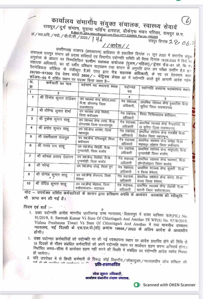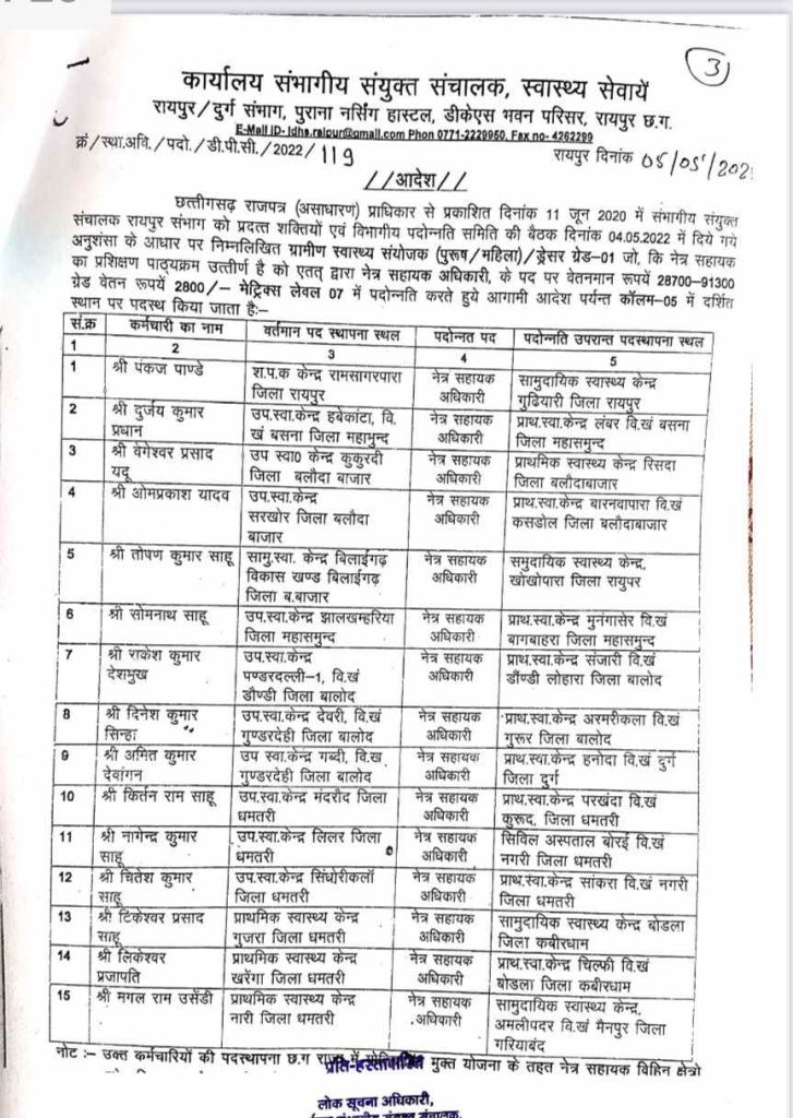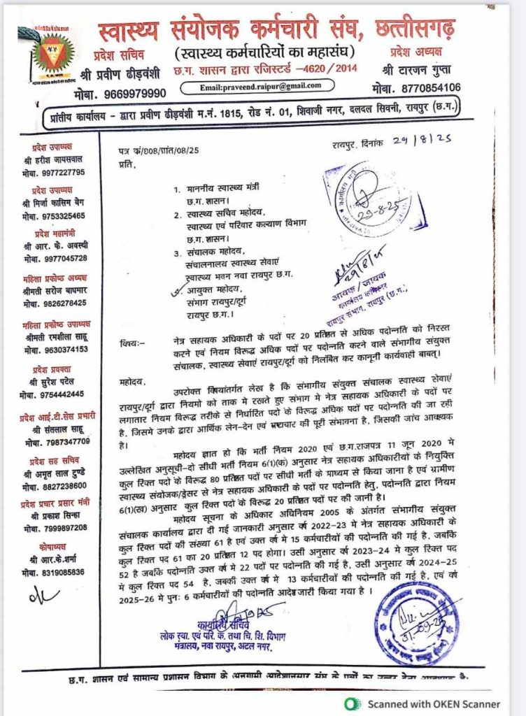 सत्या राजपूत, रायपुर. छत्तीसगढ़ के रायपुर, दुर्ग संभाग में स्वास्थ्य विभाग में नेत्र सहायक अधिकारी के पदों पर बड़े पैमाने पर नियमों का उल्लंघन करते हुए पदोन्नति घोटाला सामने आया है। 20 प्रतिशत पदोन्नति और 80 % सीधी भर्ती का प्रावधान है, इसके बावजूद हर साल पदोन्नति से पद भरे जा रहे हैं। इसका खुलासा आरटीआई से हुआ है।