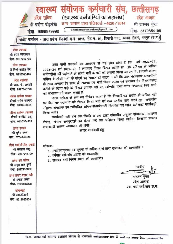 स्वास्थ्य संयोजक कर्मचारी संघ का आरोप है कि विभागीय अधिकारी नियम-कानून को ताक पर रखकर हर साल निर्धारित कोटे से अधिक प्रमोशन दे रहे हैं। पदोन्नति के नाम पर जमकर लेन-देन भी हो रही है। संघ ने दोषी अधिकारियों को हटाने और कानूनी कार्रवाई की मांग की है। संघ ने चेतावनी दी है कि यदि शीघ्र कार्रवाई नहीं हुई तो प्रदेशव्यापी आंदोलन किया जाएगा।