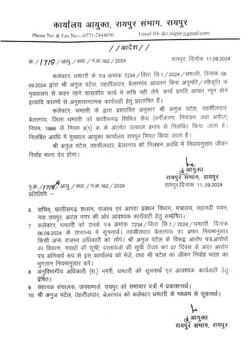 बता दें कि रायपुर कमिश्नर महादेव कावरे ने 11 सितंबर को बेलरगांव में पदस्थ तहसीलदार अनुज पटेल को निलंबित किया था. मुख्यालय से बाहर रहने और शासकीय कार्यों में अपेक्षित प्रगति नहीं होने पर यह कार्रवाई की गई थी. कमिश्नर महादेव कावरे की ओर से किए गए निलंबन आदेश में कलेक्टर धमतरी नम्रता गांधी से मिले प्रतिवेदन का जिक्र है. इस निलंबन पर ही तहसीलदार और नायब तहसीलदारों का संघ कलेक्टर के खिलाफ नाराज और आक्रोशित है.