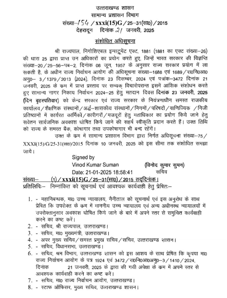 देहरादून। उत्तराखंड में नगरीय निकाय चुनाव का प्रचार प्रसार थम गया है। अब सभी पार्टी के प्रत्याशी डोर टू डोर अभियान चलाएंगे। इसी बीच सामान्य नागर निकाय निर्वाचन 2024-25 हेतु मतदान दिवस दिनांक 23 जनवरी, 2025 ( बृहस्पतिवार) को केन्द्र सरकार एवं राज्य सरकार के नियंत्रणाधीन समस्त राजकीय कार्यालय / शैक्षणिक संस्थानों/अर्द्ध-शासकीय संस्थानों/निगमों/ परिषदों / वाणिज्यिक / निजी प्रतिष्ठानों में कार्यरत कार्मिकों / कारीगरों / मजदूरों हेतु मताधिकार का प्रयोग किये जाने हेतु सवेतन सार्वजनिक अवकाश घोषित किया गया है। उक्त तिथि को राज्य के समस्त बैंक, कोषागार तथा उपकोषागार भी बन्द रहेंगे।
