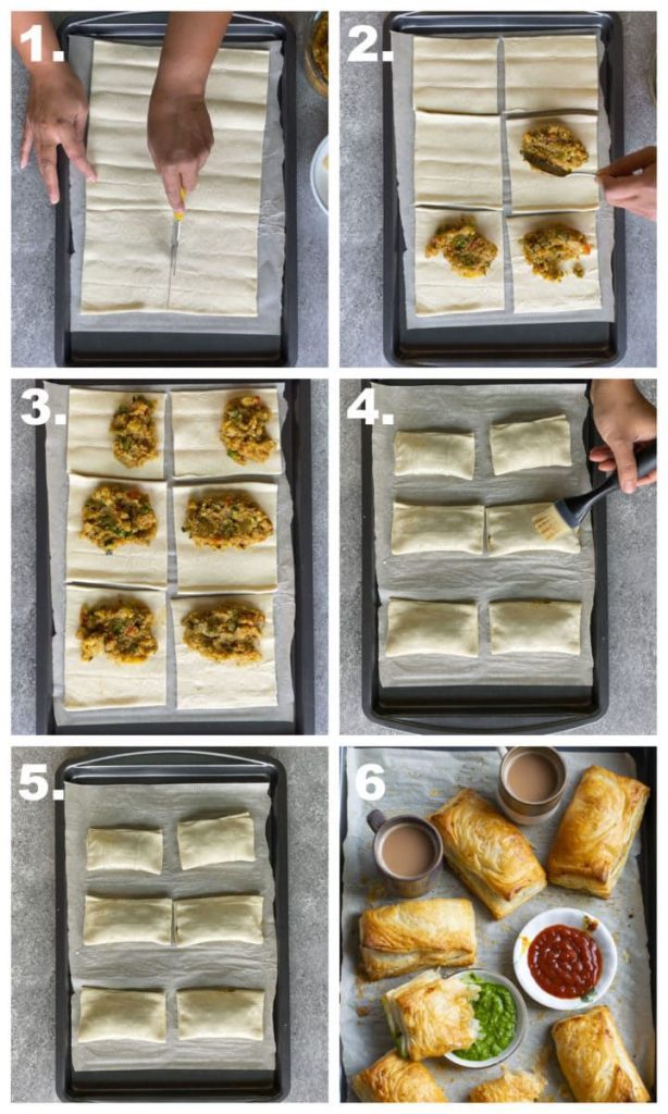 3. पफ पेस्ट्री शीट को फ्रीजर से निकालकर 5–10 मिनट नरम होने दें. हल्का सा बेल लें (ज्यादा नहीं, वरना लेयर्स दब जाएंगी). चौकोर टुकड़ों में काट लें.