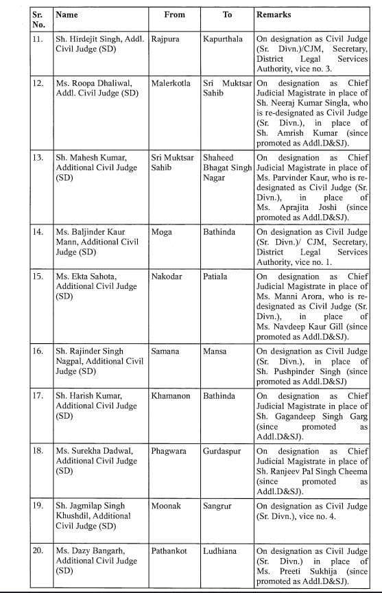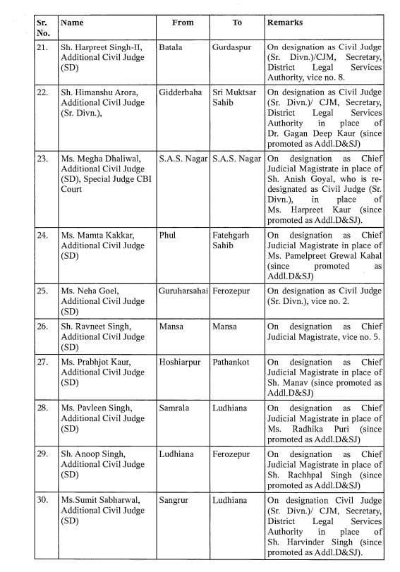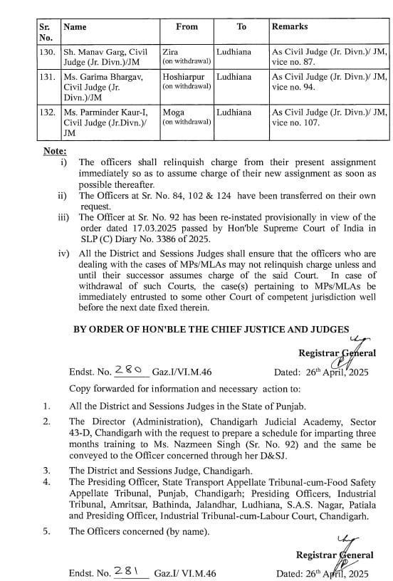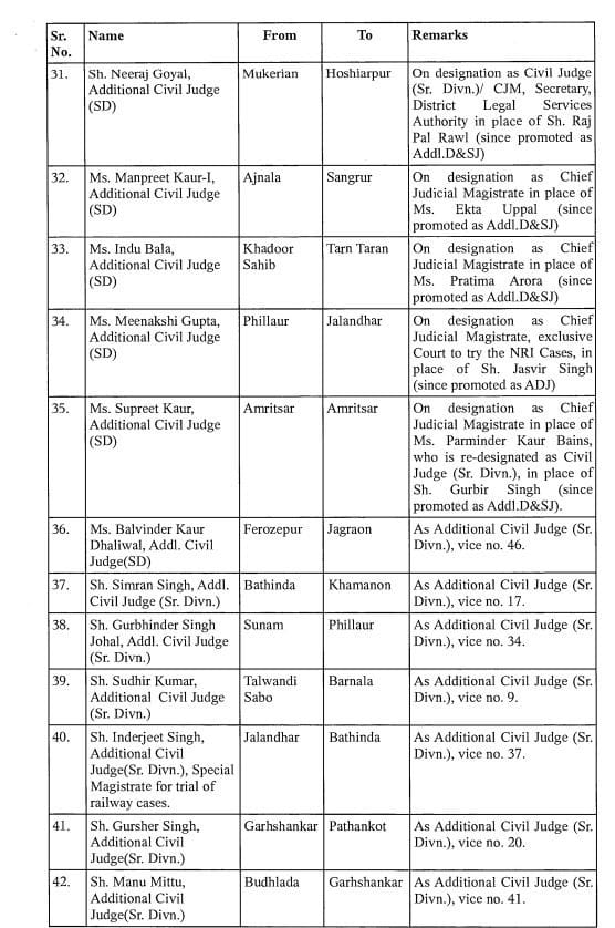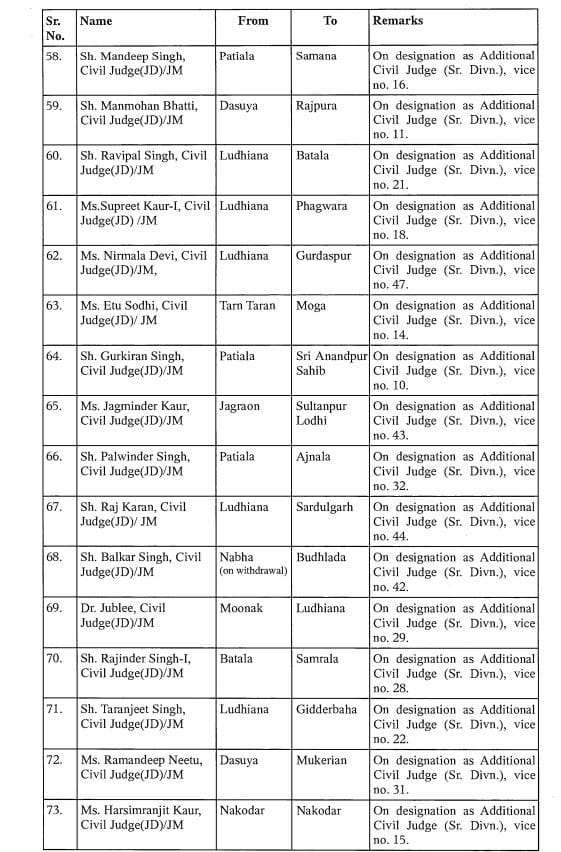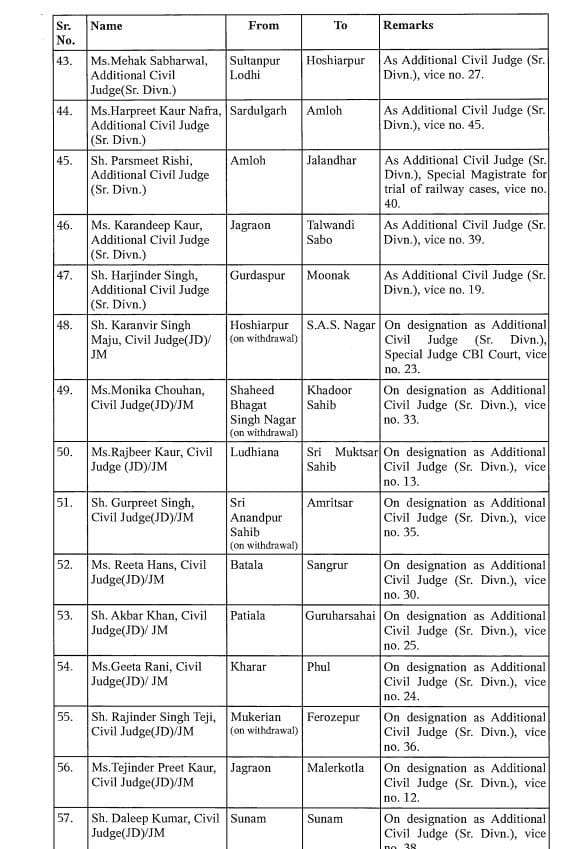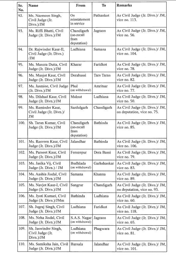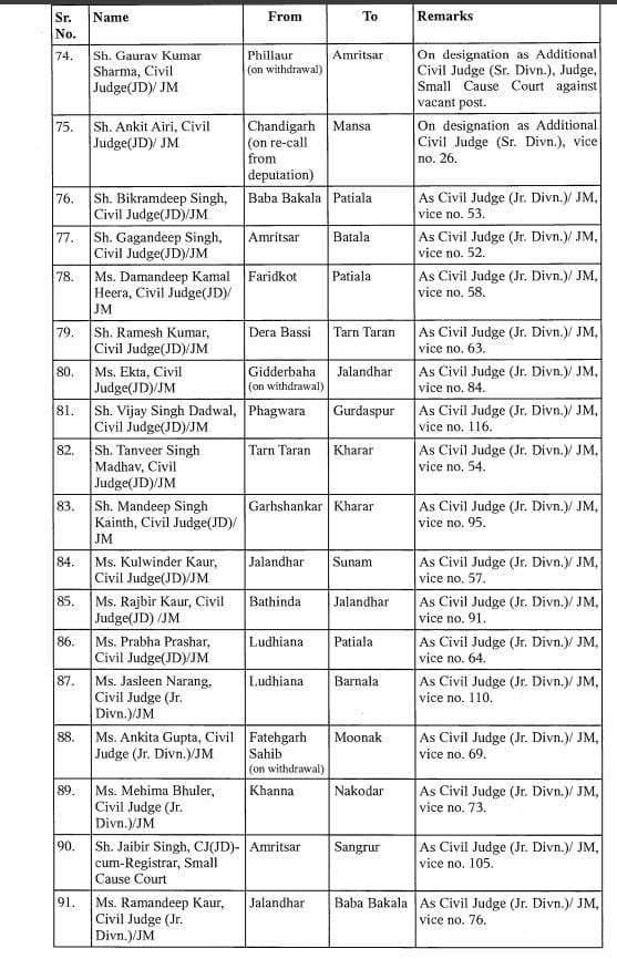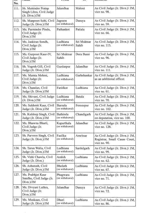 आदेश के अनुसार, अशोक कुमार चौहान को फिरोजपुर से फतेहगढ़ साहिब भेज दिया गया है. राजवंत कौर का कपूरथला से पठानकोट और गुरुकीरपाल सिंह सेखों का संगरुर से बठिंडा में तबादला हुआ है. सुरेश कुमार गोयल का बठिंडा से होशियारपुर में तबादला हुआ है. वहां पर वह सीनियर सिविल जज के तौर पर कार्यभार संभालेंगे. ऐसे ही 132 न्यायिक अधिकारियों का तबादला हुआ है.