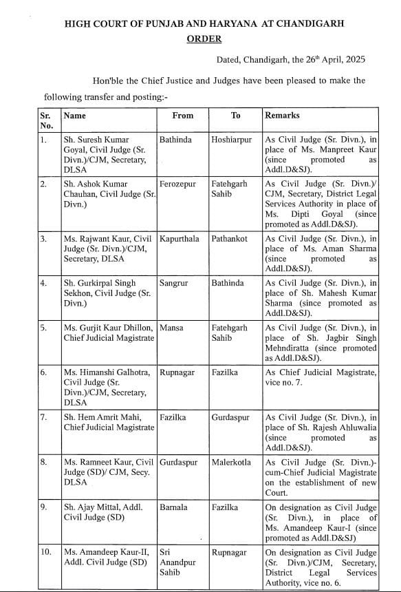 चंडीगढ़। पंजाब के न्यायिक व्यवस्था में पंजाब और हरियाणा हाई कोर्ट ने बड़ा बदलाव किया है. हाई कोर्ट ने 132 सिविल जजों, चीफ ज्यूडिशियल मजिस्ट्रेट्स और अतिरिक्त सिविल जजों के तबादले और नई नियुक्तियों का आदेश दिया है.