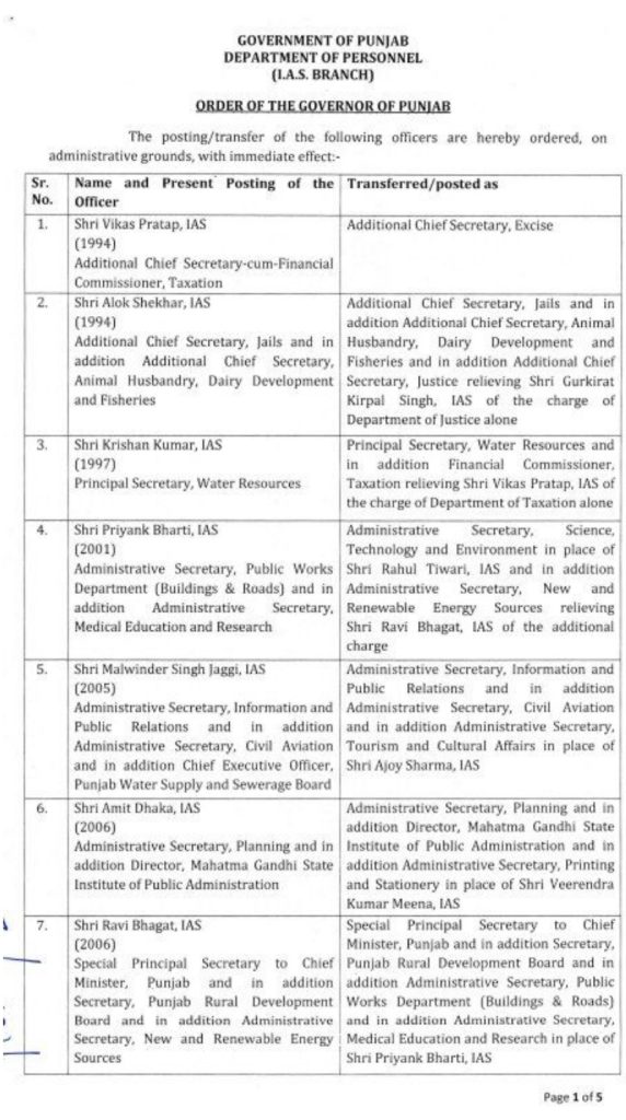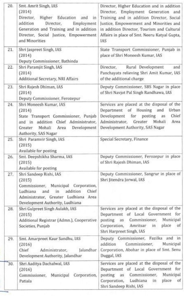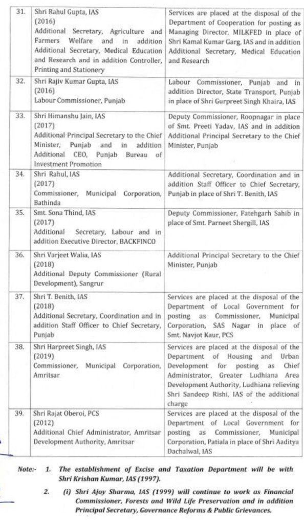 चंडीगढ़। पंजाब में एक बार फिर बड़ी प्रशासनिक सर्जरी की गई है. पंजाब सरकार ने गुरुवार को एक ही झटके में 38 आईएएस अधिकारियों का ट्रांसफर कर दिया, जिसमें 10 जिलों के डीसी भी शामिल हैं. इसके अलावा एक PCS अधिकारी का ट्रांसफर हुआ है.