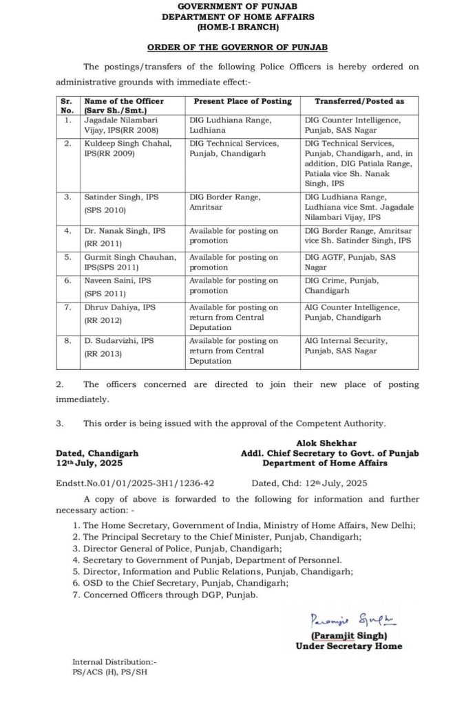 पंजाब सरकार ने एक बार फिर से पुलिस विभाग में बड़ा फेरबदल किया है। जारी आदेश के मुताबिक, DIG रैंक के 8 सीनियर अधिकारियों को तबादले व नई जगह पोस्टिंग हुई है। जारी हुई इन आदेशों को तुरन्त लागू करने के लिए कहा गया है।