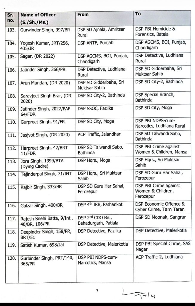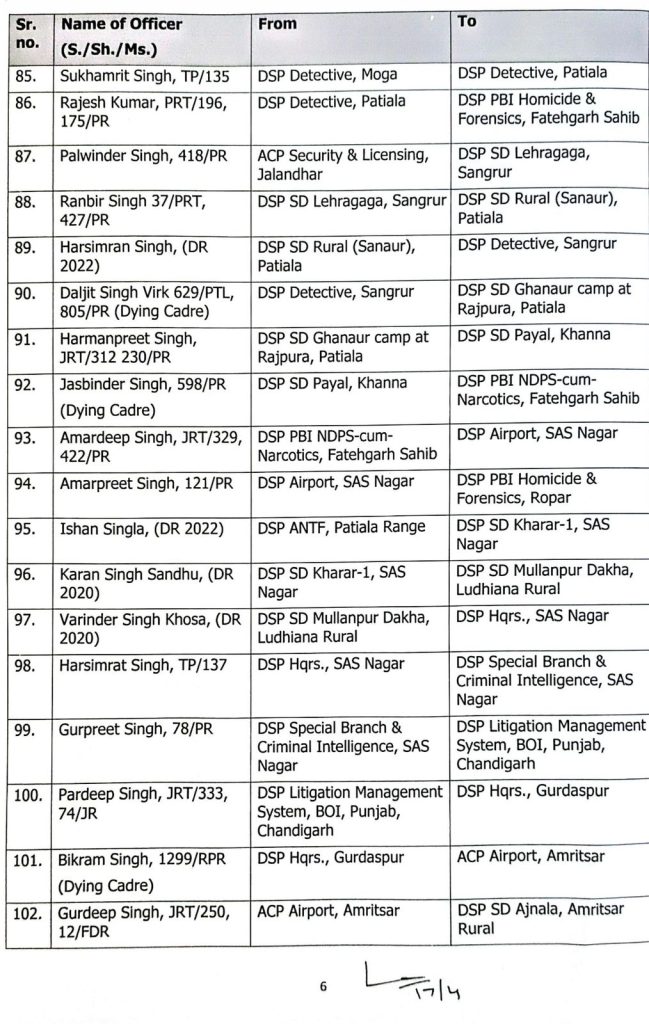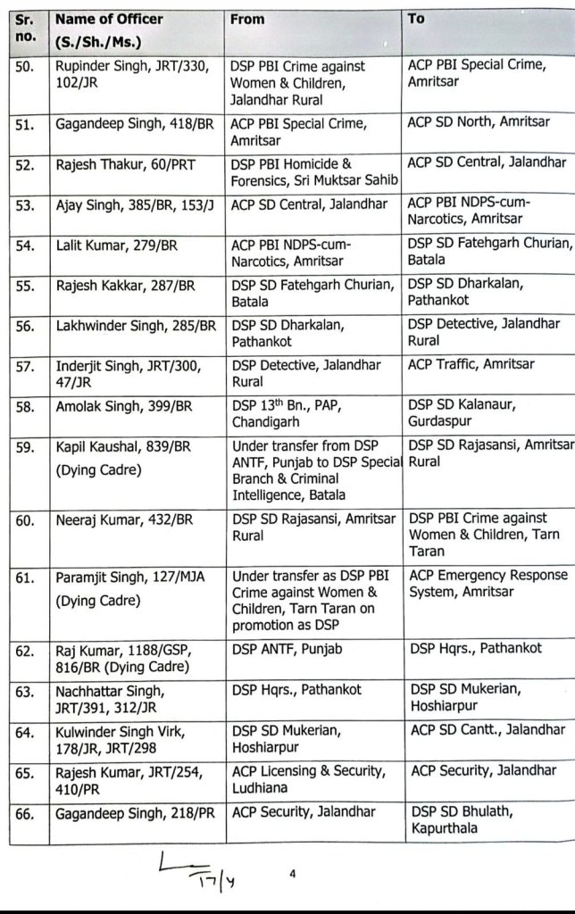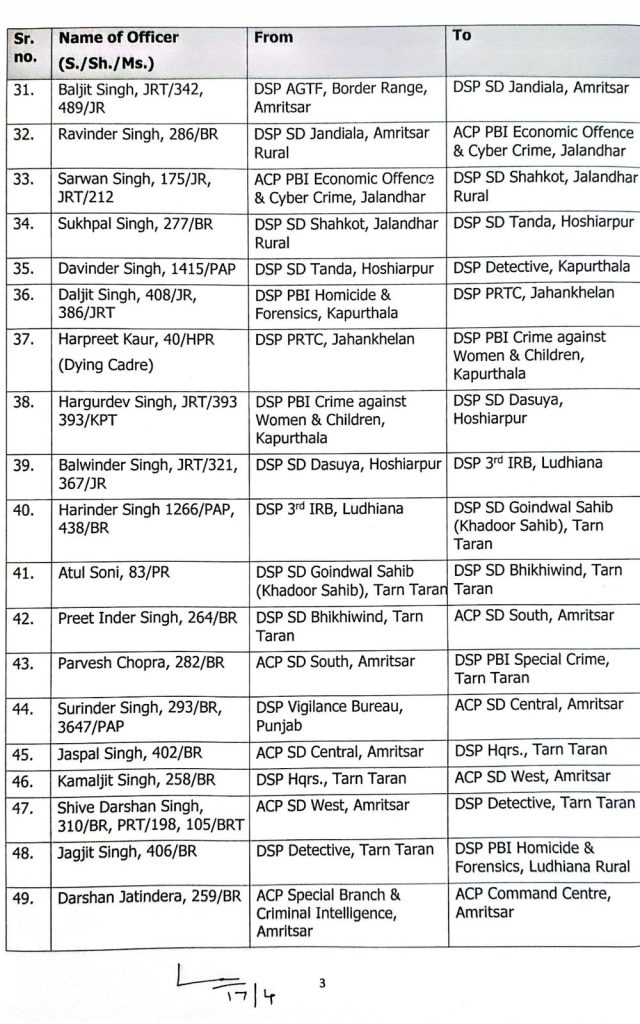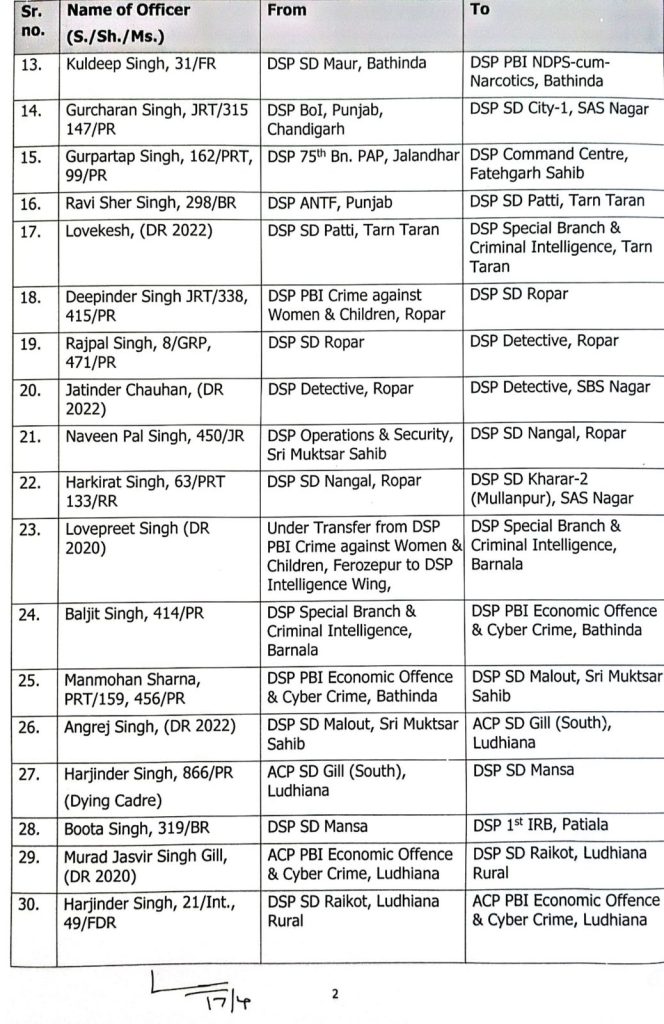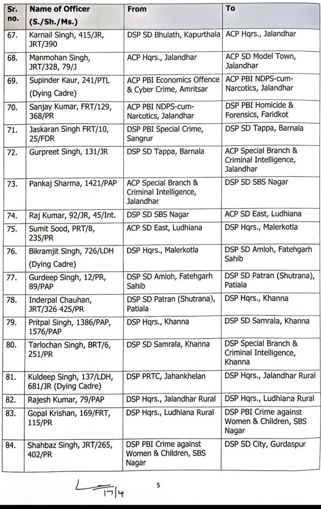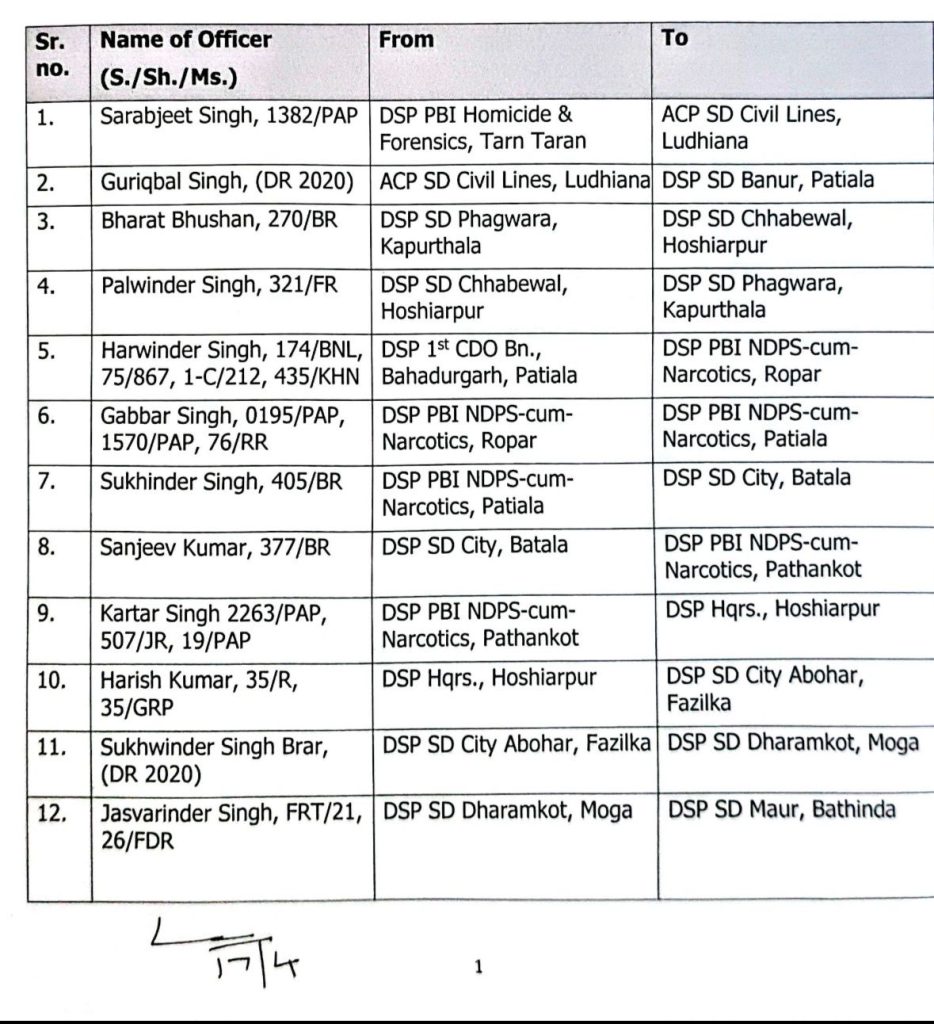 चंडीगढ़। पंजाब सरकार ने पुलिस प्रशासन में बड़ा फेरबदल किया है। सरकार ने DSP लेवल के 129 अधिकारियों का तबादला किया है। इसके लिए आदेश जारी हो चुका है इसके साथ ही सूची भी जारी कर दी गई है।