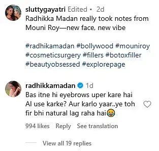 हालांकि, राधिका मदान (Radhika Madan) ने तुरंत जवाब दिया और आलोचना को मजाक में लिया है. इस पोस्ट पर तीखी टिप्पणी करते हुए राधिका मदान (Radhika Madan) ने लिखा, ‘बस इतने ही आइब्रो ऊपर करे हैं एआई का इस्तेमाल करके? और कर लो यार…ये तो फिर भी नेचुरल लग रहा है.’ एक्ट्रेस का ये वीडियो इंटरनेट पर तेजी से वायरल हो रहा था. कई सोशल मीडिया यूजर्स एडिट किए गए वीडियो के झांसे में आ गए और राधिका के इस बड़े बदलाव पर हैरानी जताई.