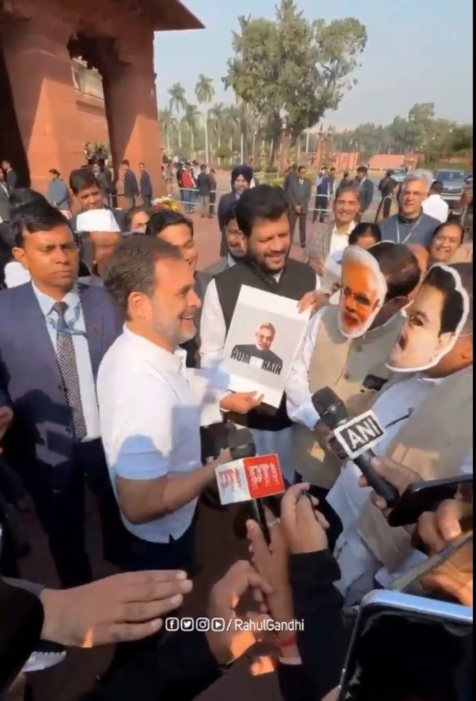 सोमवार को संसद के शीतकालीन सत्र का 10वां दिन है. इस दौरान राहुल गांधी ने गौतम अडाणी और प्रधानमंत्री नरेंद्र मोदी के मुखौटा पहने सांसदों से बातचीत की. राहुल ने सांसद से पूछा कि वह क्या कह रहे हैं?अडाणी का मुखौटा पहने हुए सांसद ने कहा कि मैं कुछ भी चाहता हूँ, सिर्फ एयरपोर्ट चाहिए. राहुल ने फिर पूछा कि अगला क्या लेने की कोशिश कर रहे हैं? राहुल जोर से हंसे जब अडाणी का मुखौटा लगाए सांसद ने कहा कि हमारा विजन साफ है वो हमारा एक्चुअली शाम को एक विशेष मीटिंग है. बगल में खड़े एक अन्य सांसद ने कहा कि भैया, ये पार्लियामेंट छोड़ दो.