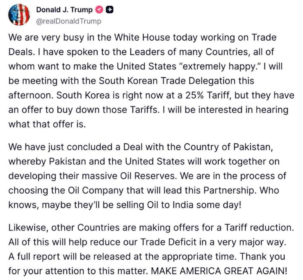 भारत पर 25% टैरिफ और जुर्माना लगाने की घोषणा करने के कुछ घंटों बाद ही इंडिया को मुंह चिढ़ाते हुए अमेरिकी राष्ट्रपति डोनाल्ड ट्रंप (Donald Trump) ने पाकिस्तान के साथ बड़ी ऑयल डील करने की घोषणा की। राष्ट्रपति ट्रंप ने कहा कि अमेरिका ने पाकिस्तान के साथ एक नया समझौता किया है, जिसके तहत दोनों देश पाकिस्तान के विशाल तेल भंडार के विकास पर मिलकर काम करेंगे।