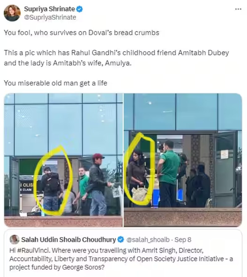 हालांकि, सलाउद्दीन शोएब चौधरी के दावे पर कांग्रेस की सुप्रिया श्रीनेत ने साफ किया कि राहुल गांधी के साथ नजर आई महिला कौन है। सुप्रिया श्रीनेत ने कहा, “आप बेवकूफ हैं। तस्वीर में राहुल गांधी के साथ उनके बचपन के दोस्त अमिताभ दुबे हैं, जबकि नजर आईं महिला उनकी पत्नी अमूल्य हैं।