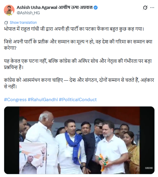 भाजपा मीडिया प्रभारी आशीष अग्रवाल ने सोशल मीडिया प्लेटफॉर्म एक्स पर लिखा, ‘भोपाल में राहुल गांधी का अपनी ही पार्टी का पटका फेंकना बहुत कुछ कह गया। जिसे अपनी पार्टी के प्रतीक और सम्मान का मूल्य न हो, वह देश की गरिमा का सम्मान क्या करेगा? यह केवल एक घटना नहीं, बल्कि कांग्रेस की अस्थिर सोच और नेतृत्व की गंभीरता पर बड़ा प्रश्नचिन्ह है। कांग्रेस को आत्ममंथन करना चाहिए। देश और संगठन, दोनों सम्मान से चलते हैं, अहंकार से नहीं।’