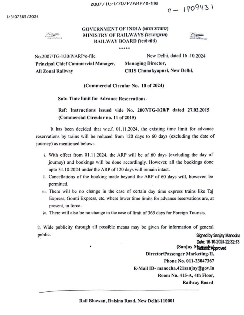 बता दें कि अभी तक भारतीय रेलवे में 120 दिन पहले भी टिकट बुक कराने का नियम है। अब आप 120 दिन के बजाय 60 दिन पहले ही टिकट बुक करा सकते हैं। रेल मंत्रालय की ओर से गुरुवार को जारी नोटिफिकेशन के मुताबिक अब एडवांस रिजर्वेशन की समय सीमा 120 दिन से घटाकर 60 दिन (यात्रा की तारीख को छोड़कर) कर दी गई है। यह व्यवस्था 1 नवंबर से लागू होगी।