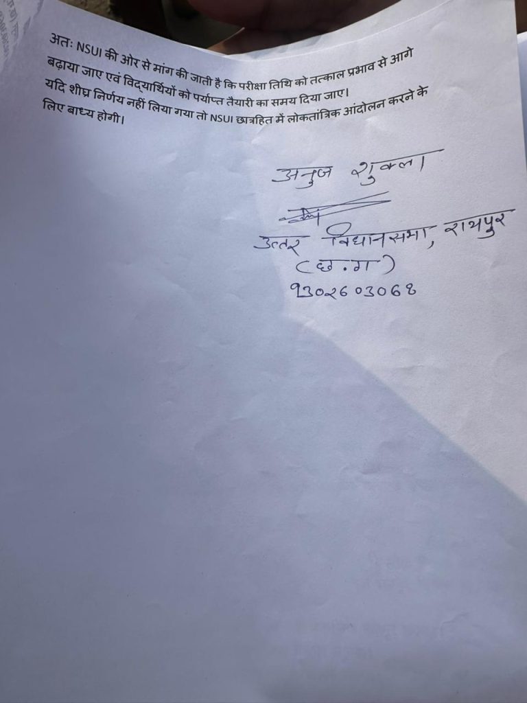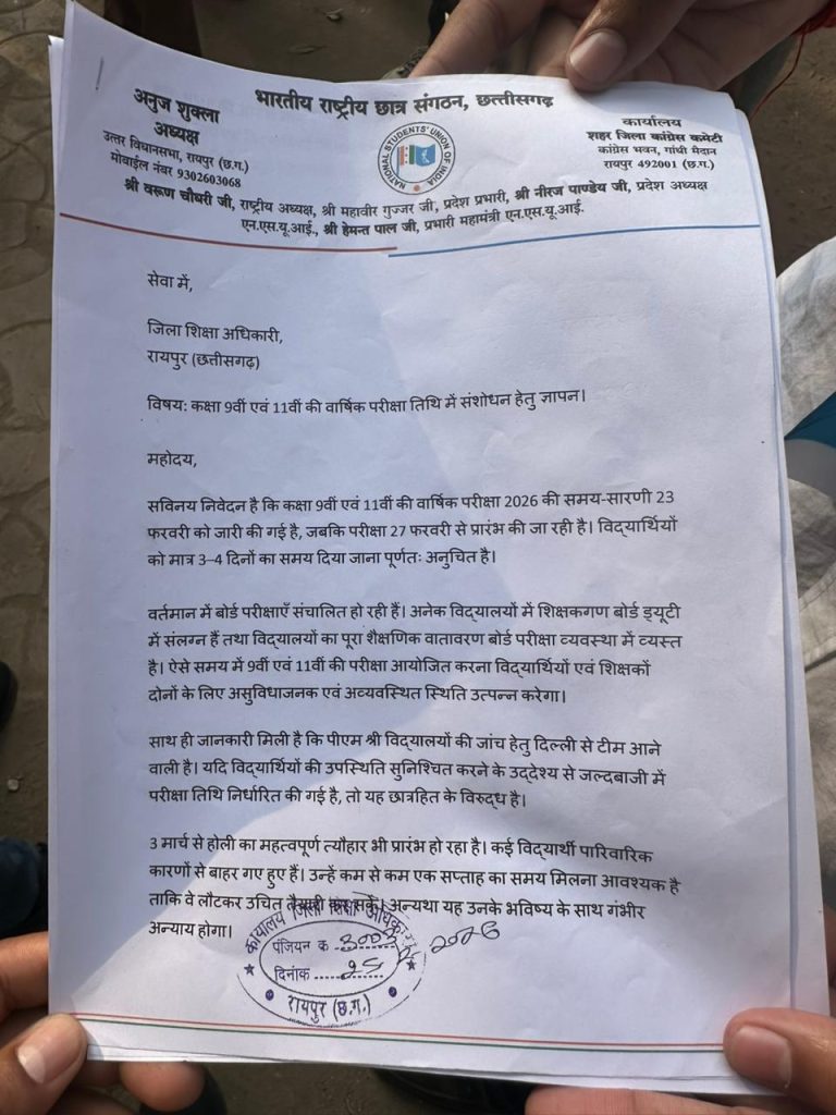 एनएसयूआई नेताओं ने यह भी कहा कि 3 मार्च से होली का महत्वपूर्ण त्योहार प्रारंभ हो रहा है। इस कारण कई विद्यार्थी पारिवारिक कारणों से शहर से बाहर गए हुए हैं। ऐसे में अचानक परीक्षा तिथि घोषित कर देना छात्रों के लिए असुविधाजनक है। संगठन ने मांग की कि कम से कम एक सप्ताह का अतिरिक्त समय दिया जाए, ताकि छात्र व्यवस्थित रूप से तैयारी कर सकें।