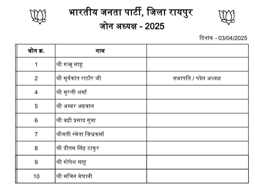 नितिन नामदेव, रायपुर. नगर निगम रायपुर के जोन अध्यक्षों का आज चुनाव होना है, जिसके लिए भारतीय जनता पार्टी ने अपने प्रत्याशियों की घोषणा कर दी है. इनमें से जोन 3 को छोड़कर बाकी अन्य जोन के लिए प्रत्याशी घोषित कर दिया है. यह भी पढ़ें : निगम-मंडल की नियुक्तियों पर नेताओं की नाराजगी आई सामने, स्वास्थ्य मंत्री बोले- अंतिम निर्णय पार्टी लेती है…