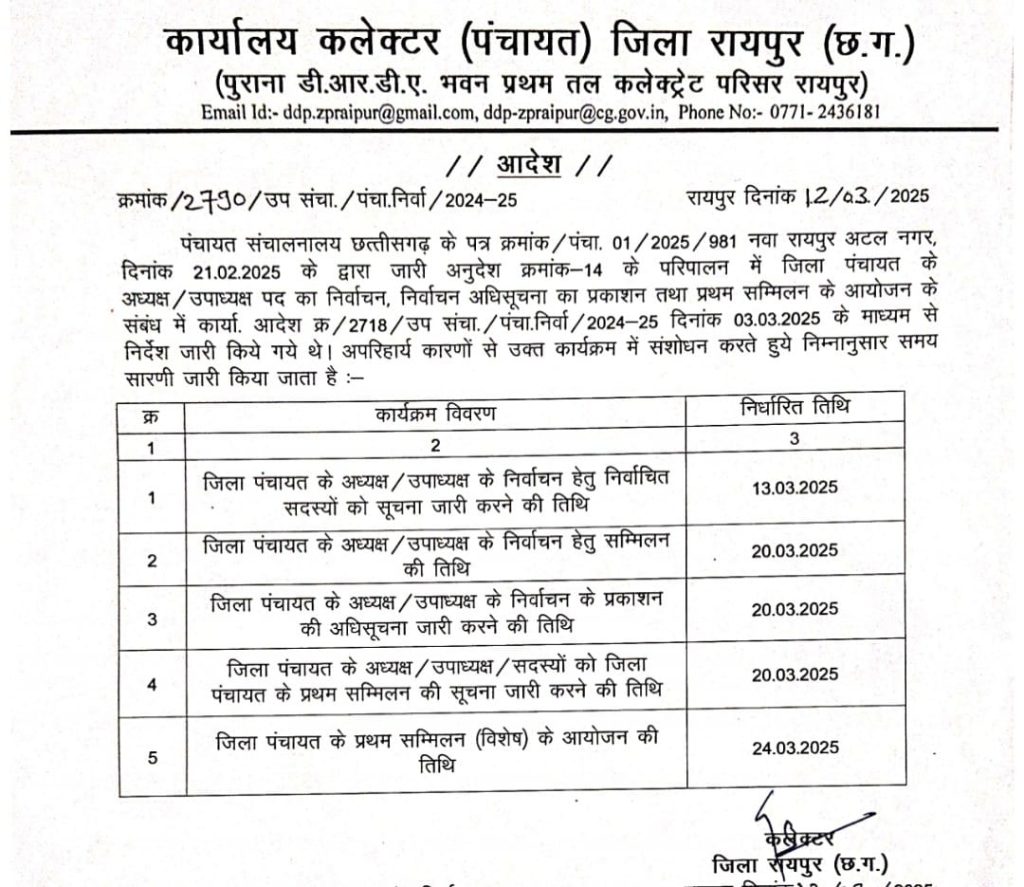 रायपुर। जिला पंचायत अध्यक्ष और उपाध्यक्ष पद के चुनाव की तिथि में एक बार फिर से बदलाव किया गया है. पहले यह चुनाव आज (12 मार्च) होना था, लेकिन अपरिहार्य कारणों से इसे संशोधित कर दिया गया है. अब यह चुनाव 20 मार्च को होगा.