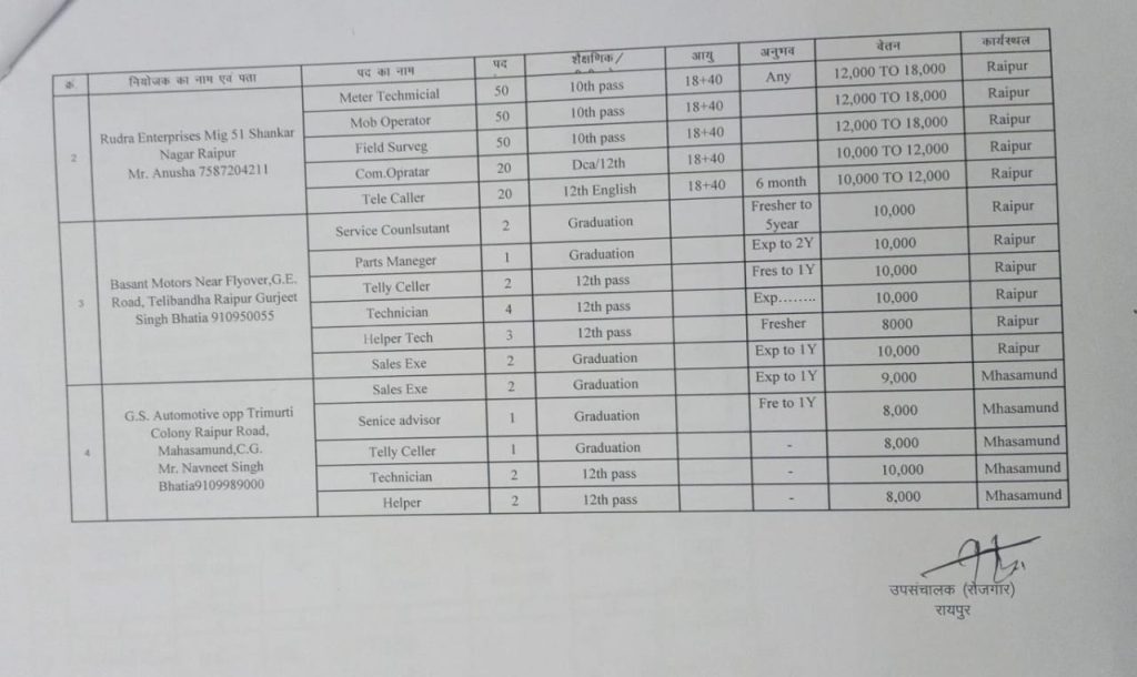 नोट: इन पदों पर छत्तीसगढ़ के सभी जिलों के नौकरी के इच्छुक एवं योग्य आवेदक, निर्धारित तिथि एवं स्थल पर अपने बायोडाटा, आधार कार्ड, शैक्षणिक और तकनीकी योग्यता व अनुभव प्रमाण-पत्रों की छायाप्रति के साथ उपस्थित हो सकते हैं। इस संबंध में अधिक जानकारी के लिए आवेदक जिला रोजगार कार्यालय, रायपुर में भी संपर्क कर सकते हैं।
