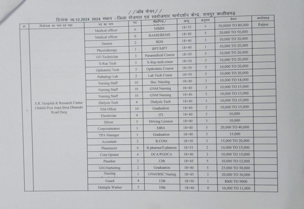 बता दें कि इस जॉब फेयर का आयोजन राजभवन के पीछे, पुराना पुलिस मुख्यालय स्थित जिला रोजगार एवं स्वरोजगार मार्गदर्शन केंद्र, रायपुर के कार्यालय में सुबह 11 बजे से दोपहर 3 बजे तक होगा। इस जॉब फेयर के माध्यम से निजी क्षेत्र के नियोजक एस.आर. हास्पिटल-चिखली (दुर्ग), रूद्रा इंटरप्राईजेस, बसंत मोटर्स एवं जी.एस. ऑटोमोबाइल, रायपुर द्वारा न्यूनतम 10वीं, 12वीं, स्नातक, स्नातकोत्तर, डी.सी.ए पास आवेदकों की भर्ती की जाएगी। इसी तरह, हास्पिटल सेक्टर के लिए एम.बी.बी.एस., बी.ए.एम.एस., बी.डी.एस., फार्मासिस्ट, एक्स-रे टेक्निशियन, लैब टैक्निशियन, नर्सिंग, डायलासिस टेक्निशियन, आई.टी.आई. (इलेक्ट्रिकल), वाहन चालक, एम.बी.ए., पी.जी.डी.सी.ए. उत्तीर्ण आवेदकों की भर्ती की जाएगी।