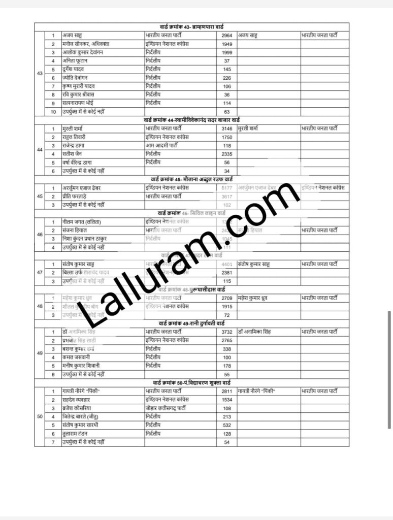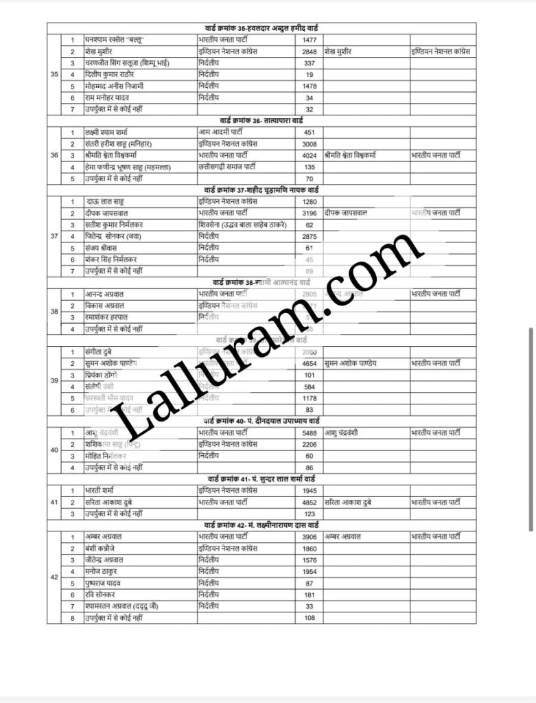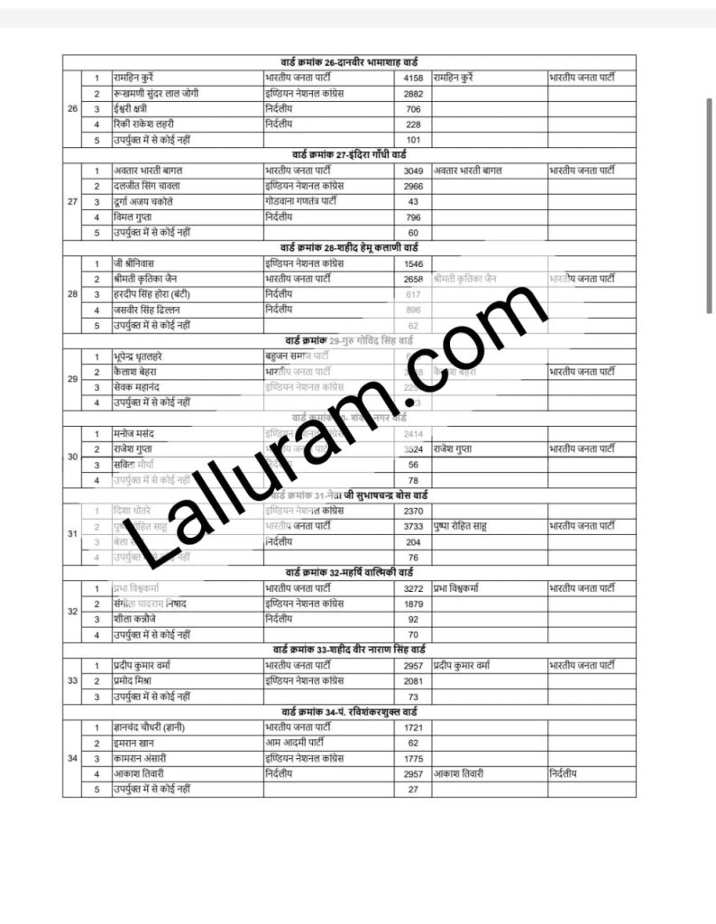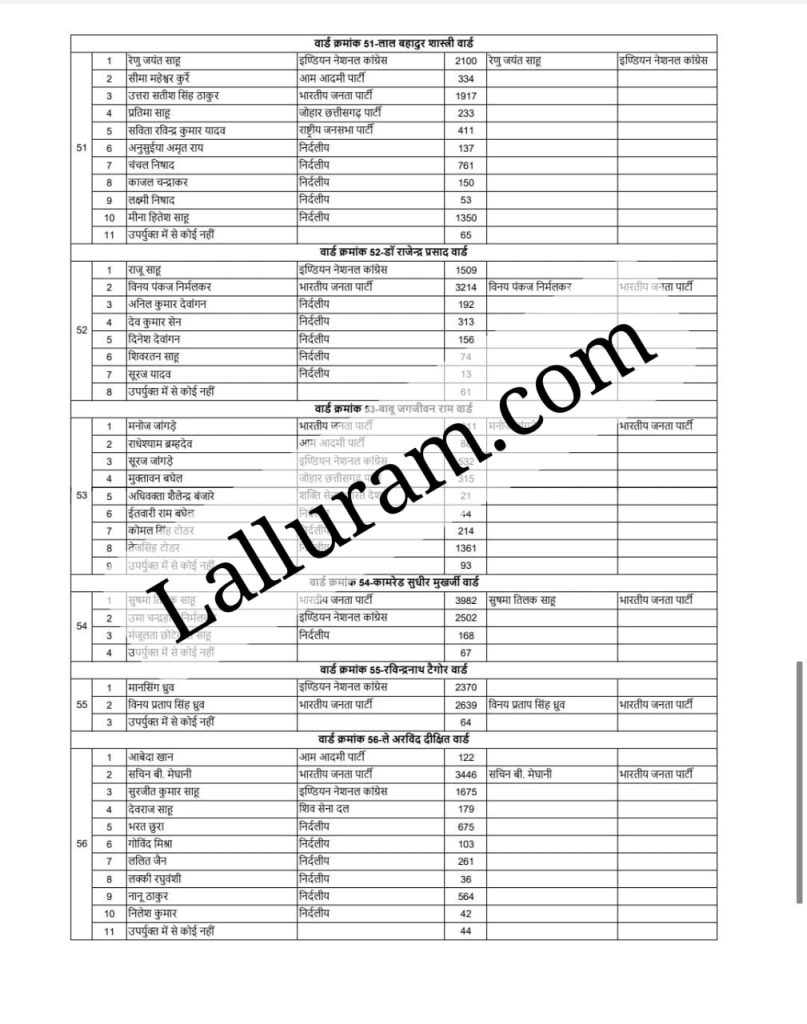 देखिये रायपुर नगर पालिका निगम के 70 वार्डों के परिणाम-