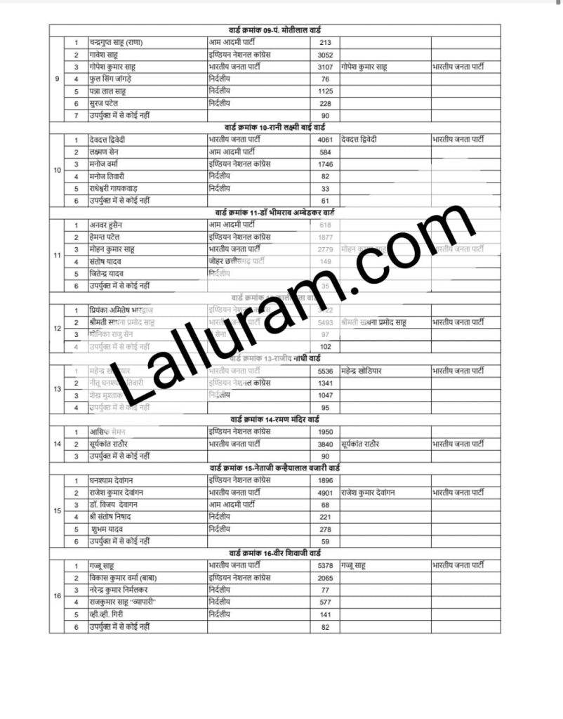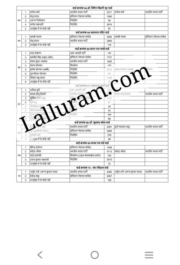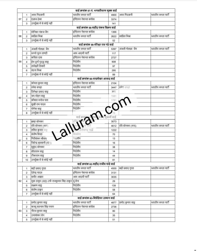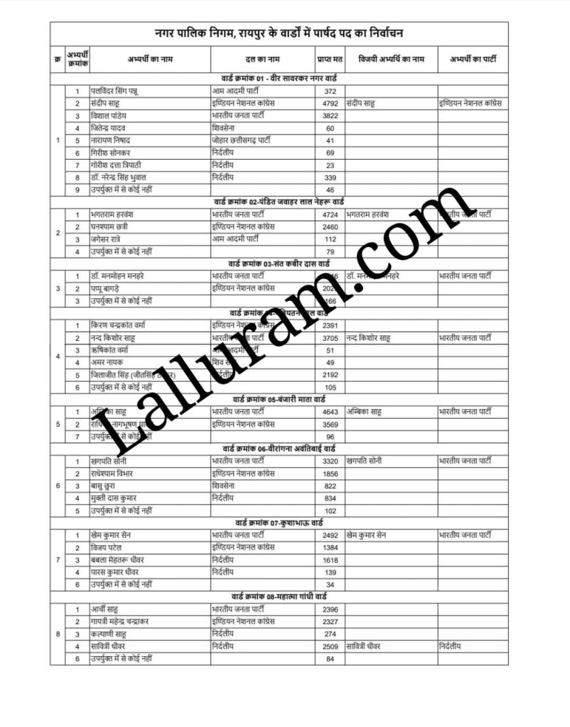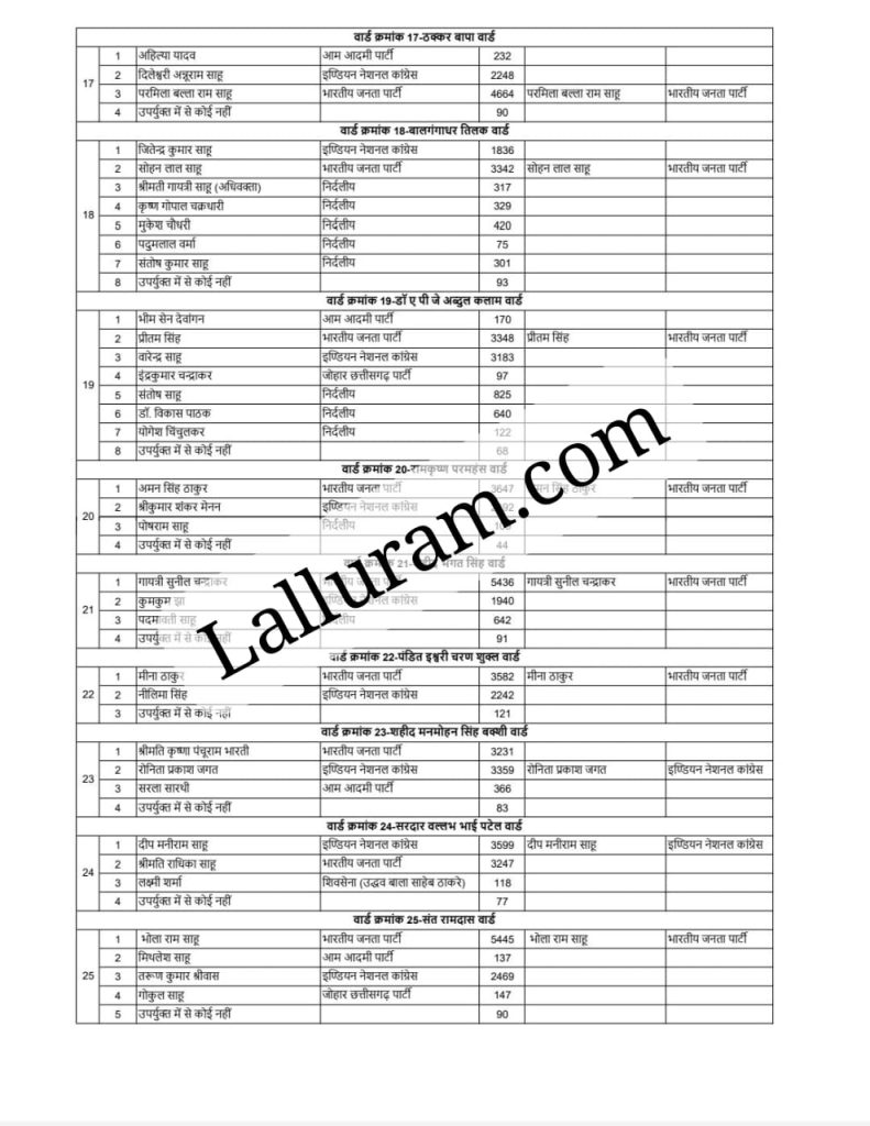 देखिये रायपुर नगर पालिका निगम के 70 वार्डों के परिणाम-