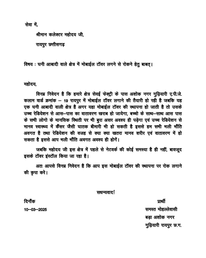 स्थानीय रहवासी रमाकांत शर्मा ने कलेक्टर से मांग करते हुए कहा कि हमारे क्षेत्र सेवई फेक्ट्री के पास अशोक नगर गुढ़ियारी ए.पी.जे. कलाम वार्ड क्रमांक 19 रायपुर में मोबाइल टावर लग रहा है. जबकि यह एक घनी आबादी वाला क्षेत्र है, अगर यहां मोबाइल टॉवर की स्थापना हो जाती है. तो उसके उच्च रेडियेशन से आस-पास का वातावरण खराब हो जायेगा.