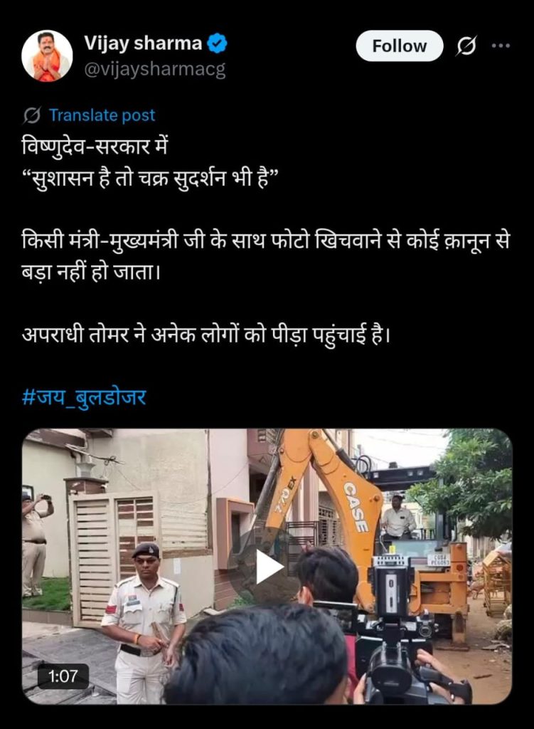 तोमर बंधुओं के दफ्तर पर बुलडोजर एक्शन को लेकर गृहमंत्री विजय शर्मा का बयान सामने आया है. उन्होंने सोशल मीडया पोस्ट में कहा कि विष्णुदेव सरकार में “सुशासन है तो चक्र सुदर्शन भी है”, किसी मंत्री-मुख्यमंत्री के साथ फोटो खिंचवाने से कोई कानून से बड़ा नहीं बन जाता. अपराधी तोमर ने कई लोगों को पीड़ा पहुंचाई है.