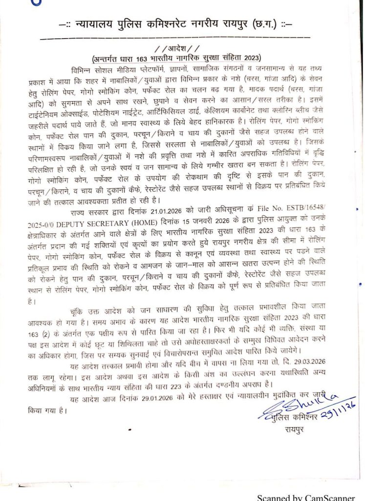 रायपुर। नाबालिगों और युवाओं में नशे की बढ़ती प्रवृत्ति को देखते हुए रायपुर पुलिस कमिश्नरेट ने बड़ा फैसला लिया है। रायपुर नगरीय क्षेत्र में रोलिंग पेपर, गोगो स्मोकिंग कोन और पर्फेक्ट रोल की बिक्री पर पूर्ण प्रतिबंध लगा दिया गया है। यह आदेश तत्काल प्रभाव से लागू हो गया है और 29 मार्च 2026 तक प्रभावी रहेगा।
